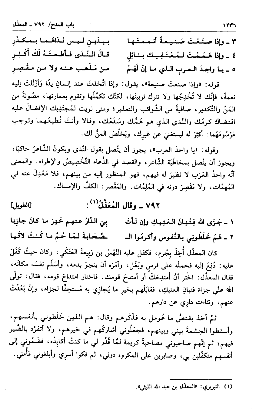 قوله وإذا صنعت صنيعة، يقول: وإذا اتخذت عند إنسان يداً وأزللت إليه نعمة، فإنك لا تخدجها ولا تترك ترتيبها، لكنك تكملها وتقوم بعنراتها، مصونة منالمن والتكدير، صافية من الشوائب والتعذير؛ ومتى نويت لمجتديك الإفضال عليه اقتضاك كرمك والندى الذي هو همك وسدمك، وقالا وأنت تطيعمها وتوجب مرسومهما: أكثر له ليستغني عن غيرك، ويخلص المن لك. وقوله يا واحد العرب، يجوز أن يتصل بقول الندى ويكون الشاعر حاكياً، ويجوز أن يتصل بمخاطبة الشاعر، والقصد في الدعاء التخصيص والإطراء. والمعنى أنه واحد العرب لا نظير له فيهم، فهو المنظور إليه من بينهم، فلا معدل عنه في المهمات، ولا مقصر دونه في الملمات. والمقصر: الكف والإمساك.
