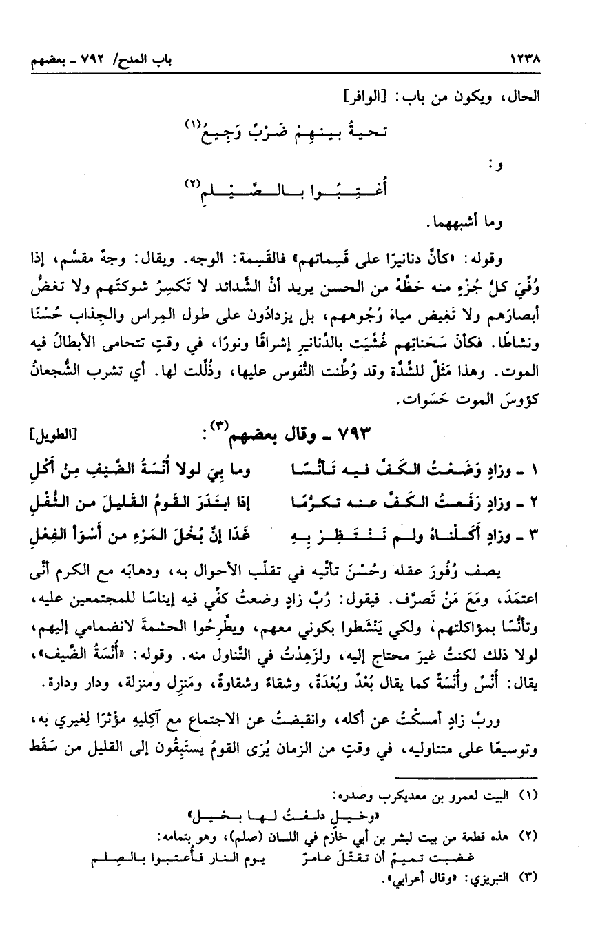 يصف وفور عقله وحسن تأتيه في تقلب الأحوال به، وذهابه مع الكرم أني اعتمد، ومع من تصرف. فيقول: رب زاد وضعت كفي فيه إيناساً للمجتمعين عليه، وتأنساً بمؤاكلتهم، ولكي ينشطوا بكوني معهم، ويطرحوا الحشمة لانضمامي إليهم، لولا ذلك لكنت غير محتاج إليه، ولزهدت في التناول منه. وقوله أنسة الضيف، يقال انس وأنسة كما يقال: بعد وبعدة، وشقاء وشقاوة، ومنزل ومنزلة، ودار ودارة.
