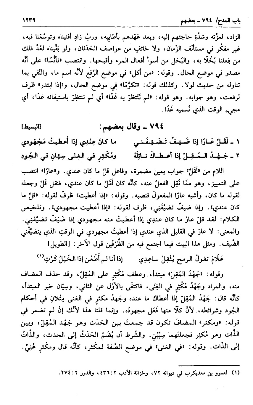 وقوله جهد المقل مبتدأ، وعطف مكثر على المقل، وقد حذف المضاف منه، والمراد وجهد مكثر في الغنى، فاكتفى بالأول عن الثاني، وسيان خبر المبتدأ، كأنه قال: جهد المقل إذا أعطاك ما عنده وجهد مكثر في الغنى مثلان في أحكام الجود وشرائطه، لأن كلاً منها قتل مجهوده. وإنما قلنا هذا لأنكإن لم تضمر في قوله ومكثر المضاف تكون قد جمعت بين الحدث وهو جهد المقل، وبين الذات وهو مكثر فجعلتهما سبين. والشرط أن يضم الحدث إلى الحدث، والذات إلى الذات. وقوله في الغنى في موضع الصفة لكثر، كأنه قال ومكثر غنى.