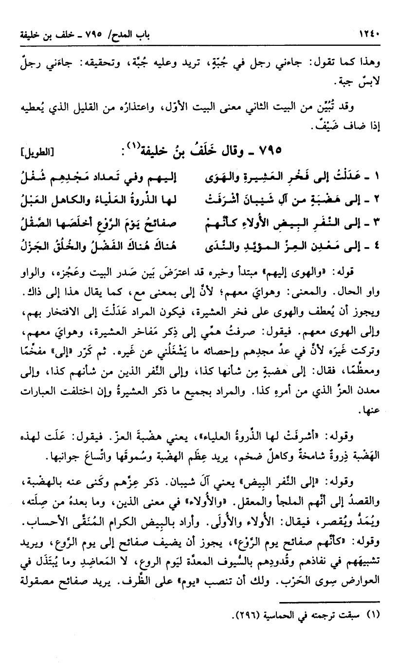 وقوله إلى النفر البيض يعني آل شيبان. ذكر عزهم وكنى عنه بالهضبة، والقصد إلى أنهم الملجأ والمعقل. والأولاء في معنى الذين، وما بعده من صلته، ويمد ويقصر، فيقال الأولاء والأولى. وأراد بالبيض الكرام المنقي الأحساب. وقوله كأنهم صفائح يوم الروع، يجوز أن يضيف صفائح إلى يوم الروع، ويريد تشبيههم في نفاذهم وقدودهم بالسيوف المعدة ليوم الروع، لا المعاضد وما يبتذل في العوارض سوى الحرب. ولك أن تنصب يوم على الظرف. يريد صفائح مصقولة