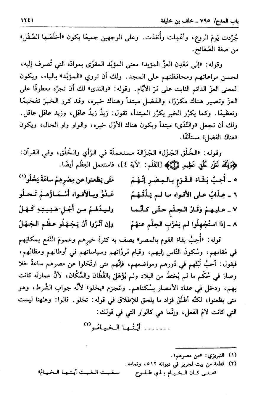 وقوله إلى معدن العز المؤيد معنى المؤيد المقوي بمواده التي تصرف إليه، لحسن مراعاتهم ومحافظتهم على المجد. ولك أن تروى المؤبد بالباء، ويكون المعنى العز الدائم الثابت على مر الأيام. وقوله والندى لك أن تجره معطوفاً على العز وتصير هناك مكرراً، والفضل مبتدأ وهناك خبره، وقد كرر الخبر تفخيماً وتعظيماً. وكما يكرر الخبر يكرر المبتدأ، تقول: زيد زيد عاقل، وزيد عاقل عاقل. ولك أن تجعل والندى مبتدأ ويكون هناك الأول خبره، والواو واو الحال، ويكون هناك الفضل مستأنفاً.