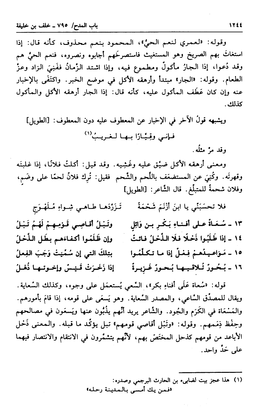 وقوله " لعمري لنعم الحي "، المحمود بنعم محذوف، كأنه قال: إذا استغاث بهم الصريخ وهو المستغيث فاستصرخهم أجابوه ونصره، فنعم الحي وقد دعوا، إذا الجار مأكولٌ ومطموع فيه، وإذا اشتد الزمان ففني الزاد وعز الطعام. وقوله " الجار " مبتدأ وأرهقه الأكل في موضع الخبر. واكتفى بالإخبار عنه وإن كان عطف المأكول عليه، كأنه قال: إذا الجار أرهقه الأكل والمأكول كذلك.