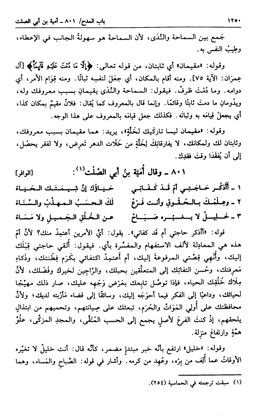 قوله " أأذكر حاجتي أم قد كفاني ". يقول: أي الأمرين أعتمد منك؟ لأن أم هذه هي المعادلة لألف الاستفهام والمفسرة بأي. فيقول: ألقى حاجتي قبلك إليك، وأنهى قصتي المرفوعة إليك، ام أعتمد اكتفائي بكرم فطنتك، وذكاء معرفتك، وحسن التفاتك إلى المعلقتين بحبلك، والراجين لخيرك وفضلك، لأن ملاك خلقك الحياء، فإذا توصل تابعلكبعرض وجهه عليك، صار ذلك مهيجاً لحيائك، وداعياً إلى الفكر فيما أحوجه إليك، وسائقاً إلى قضاء مأربته لديك؛ ولأن محافظتك على أولى المواتوالحرم، تبعثك على صيانتهم، وتحميهم من ابتذالٍ يلحقهم، إذ كنت الفرع لأصلٍ يجمع إلى الحسب المنقى، والمجد المزكى، علو همة وارتفاع منزلة.