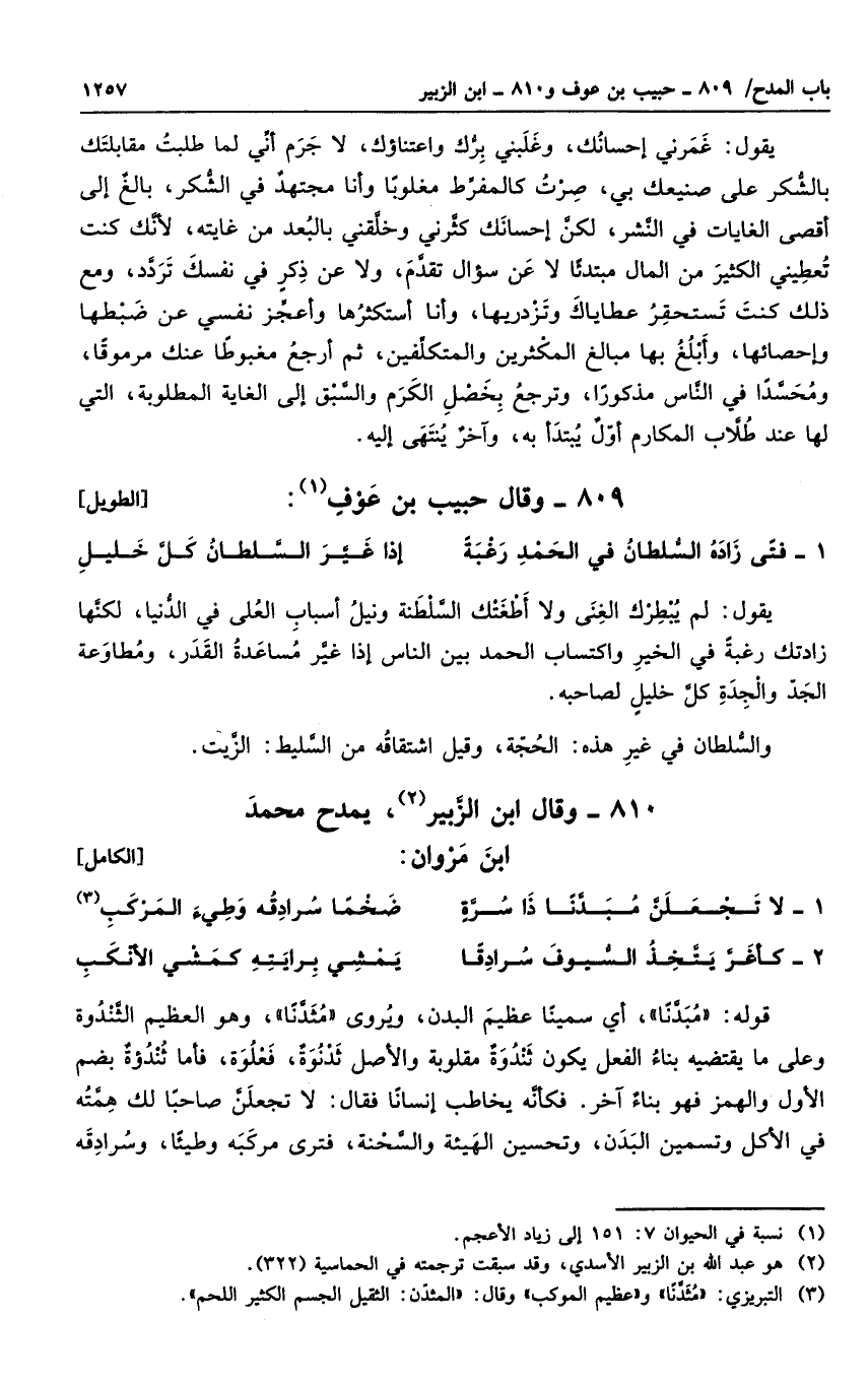 قوله " مبدناً "، أي سمينا عظيم البدن، ويروى " مثدناً "، وهو العظيم الثندوة وعلى ما يقتضيه بناء الفعل يكون ثندوة مقلوبة والأصل ثدوةٌ، فعلوة، فأما ثندوةٌ بضم الأول والهمز فهو بناءٌ آخر. فكأنه يخاطب إنساناً فقال: لا تجعلن صاحباً لك همته في الأكل وتسمين البدن، وتحسين الهيئة والسحنة، فترى مركبه وطيئاً، وسرادقة