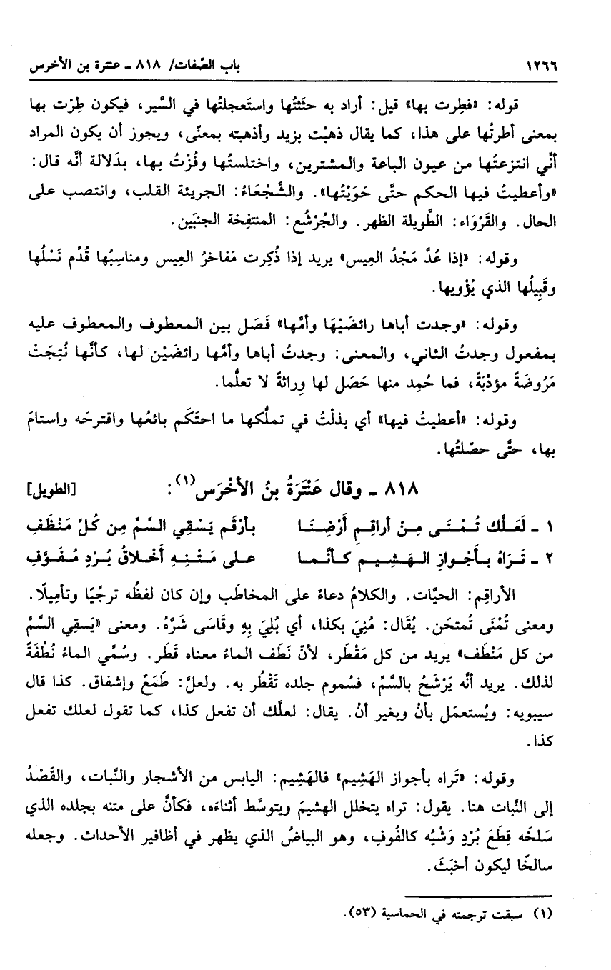 الأراقم: الحيات. والكلام دعاءٌ على المخاطب وإن كان لفظه ترجياً وتأميلاً. ومعنى تمنى تمتحن. يقال: مني بكذا، أي بلي به وقاسى شره. ومعنى " يسقي السم من كل منطف " يريد من كل مقطر، لأن نطف الماء معناه قطر. وسمي الماء نطفةً لذلك. يريد أنه يرشح بالسم، فسموم جلده تقطر به. ولعل: طمعٌ وإشفاق. كذا قال سيبويه. ويستعمل بأن وبغير أن. يقال: لعلك أن تفعل كذا، كما تقول لعلك تفعل كذا.