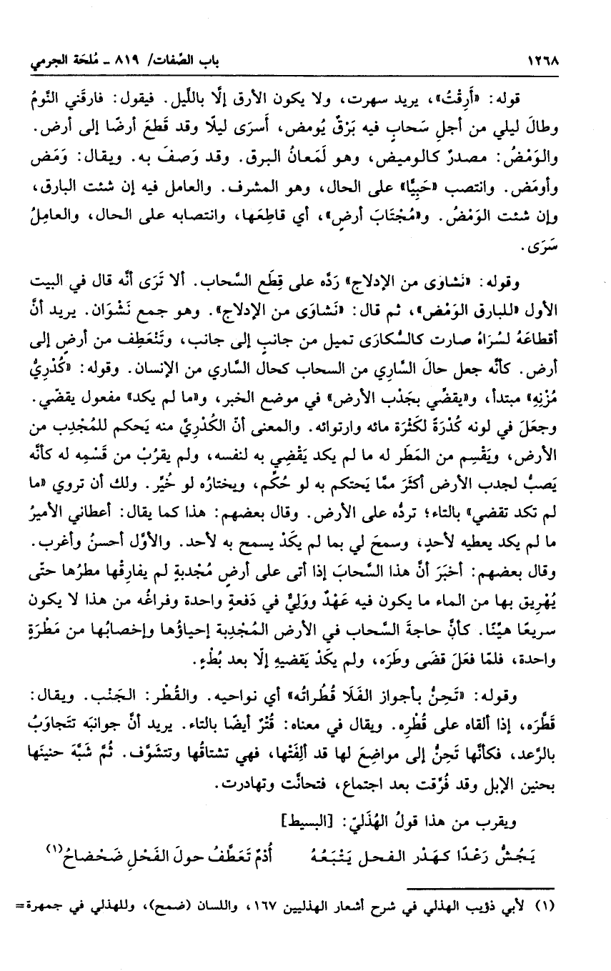 وقوله " نشاوى من الإدلاج " رده على قطع السحاب. ألا ترى أنه قال في البيت الأول " للبارق الومض "، ثم قال " نشاوى من الإدلاج ". وهو جمع نشوان. يريد أن أقطاعه لسراه صارت كالسكارى تميل من جانبٍ إلى جانب، وتنعطف من أرضٍ إلى أرض. كأنه جعل حال الساري من السحاب كحال الساري من الإنسان. وقوله " كدري مزنه " مبتدأ، و " يقضي بجدب الأرض " في موضع الخبر، و " ما لم يكد " مفعول يقضي. وجعل في لونه كدرةً لكثرة مائه وارتوائه. والمعنى أن الكدري منه يحكم للمجدب من الأرض، ويقسم من المطر له ما لم يكد يقضي به لنفسه، ولم يقرب من قسمه له كأنه يصب لجدب الأرضأكثر مما يتحكم به لو حكم، ويختاره لو خير. ولك أن تروى " ما لم تكد تقضى " بالتاء؛ ترده على الأرض. وقال بعضهم: هذا كما يقال: أعطاني الأمير ما لم يكد يعطيه لأحد، وسمح لى بما لم يكد يسمح به لأحد. والأول أحسن وأغرب. وقال بعضهم: أخبر أن هذا السحاب إذا أتى على أرض مجدبة لم يفارقها مطرها حتى يهريقبها من الماء ما يكون فيه عهد ووليفي دفعة واحدة، وفراغه من هذا لا يكون سريعا هينا. كأن حاجة السحاب في الأرض المجدبة إحياؤها وإخصابها من مطرة واحدة، فلما فعل قضى وطره، ولم يكد يقضيه إلا بعد بطء.
