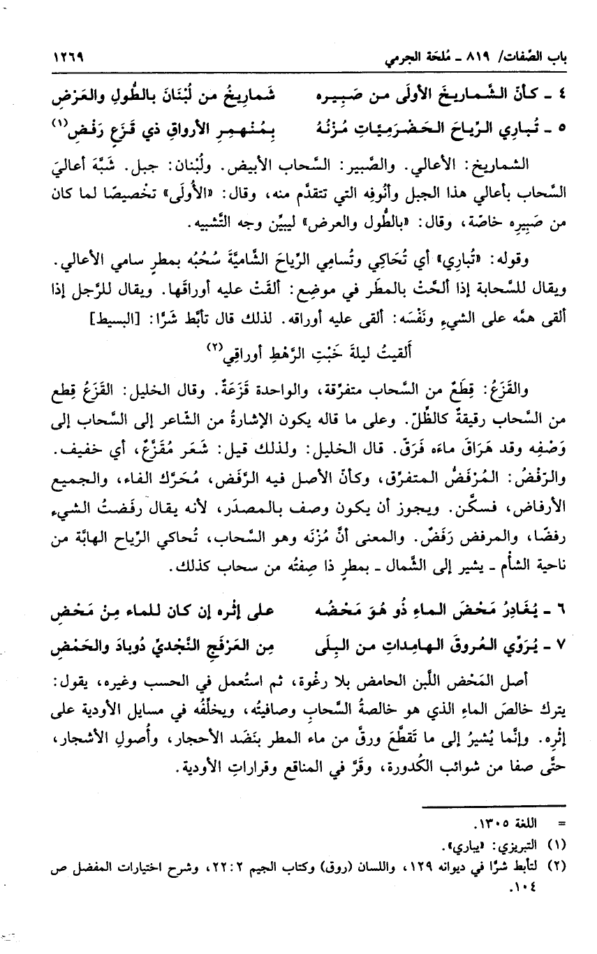 وقوله " تبارى " أى تحاكى وتسامى الرياح الشامية سحبه بمطر سامى الأعالى. ويقال للسحابة إذا ألحت بالمطر فى موضع: ألقت عليه أرواقها.