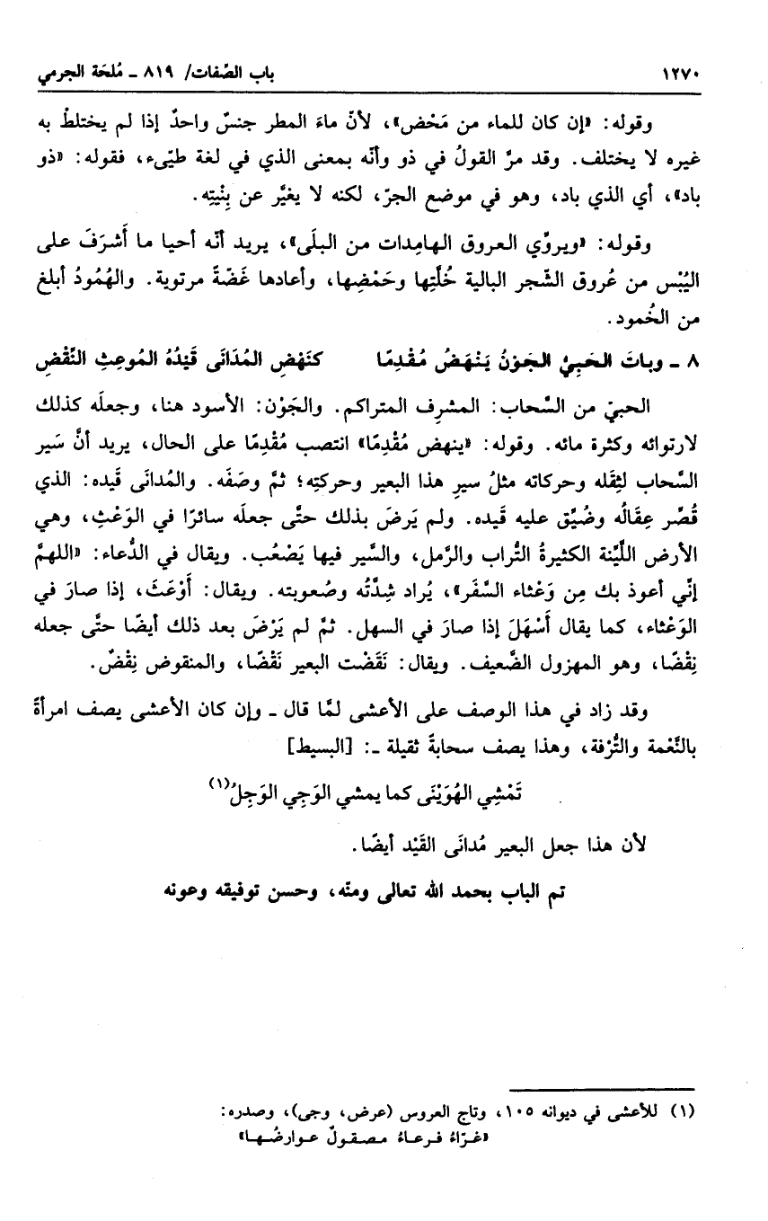الحبى من السحاب: المشرف المتراكم. والجون؛ الأسود هنا، وجعله كذلك لا رتوائه وكثرة مائه. وقوله " ينهض مقدماً " انتصب مقدماً على الحال، يريد أن سير السحاب لثقله وحركاته مثل سير هذا البعير وحركته؛ ثم وصفه. والمدانى قيده: الذي قصر عقاله وضيق عليه قيده. ولم يرض بذلك حتى جعله سائراً في الوعث، وهي الأرض اللينة الكثيرة التراب والرمل؛ والسير فيها يصعب. ويقال في الدعاء: " اللهم إني أعوذ بك من وعثاء السفر "، يراد شدته وصعوبته. ويقال: أوعث، إذا صار في الوعثاء، كما يقال أسهل إذا صار في السهل. ثم لم يرض بعد ذلك أيضاً حتى جعله نقضاً، وهو المهزول الضعيف. ويقال نقضت البعير نقضاً، والمنقوض نقضٌ.