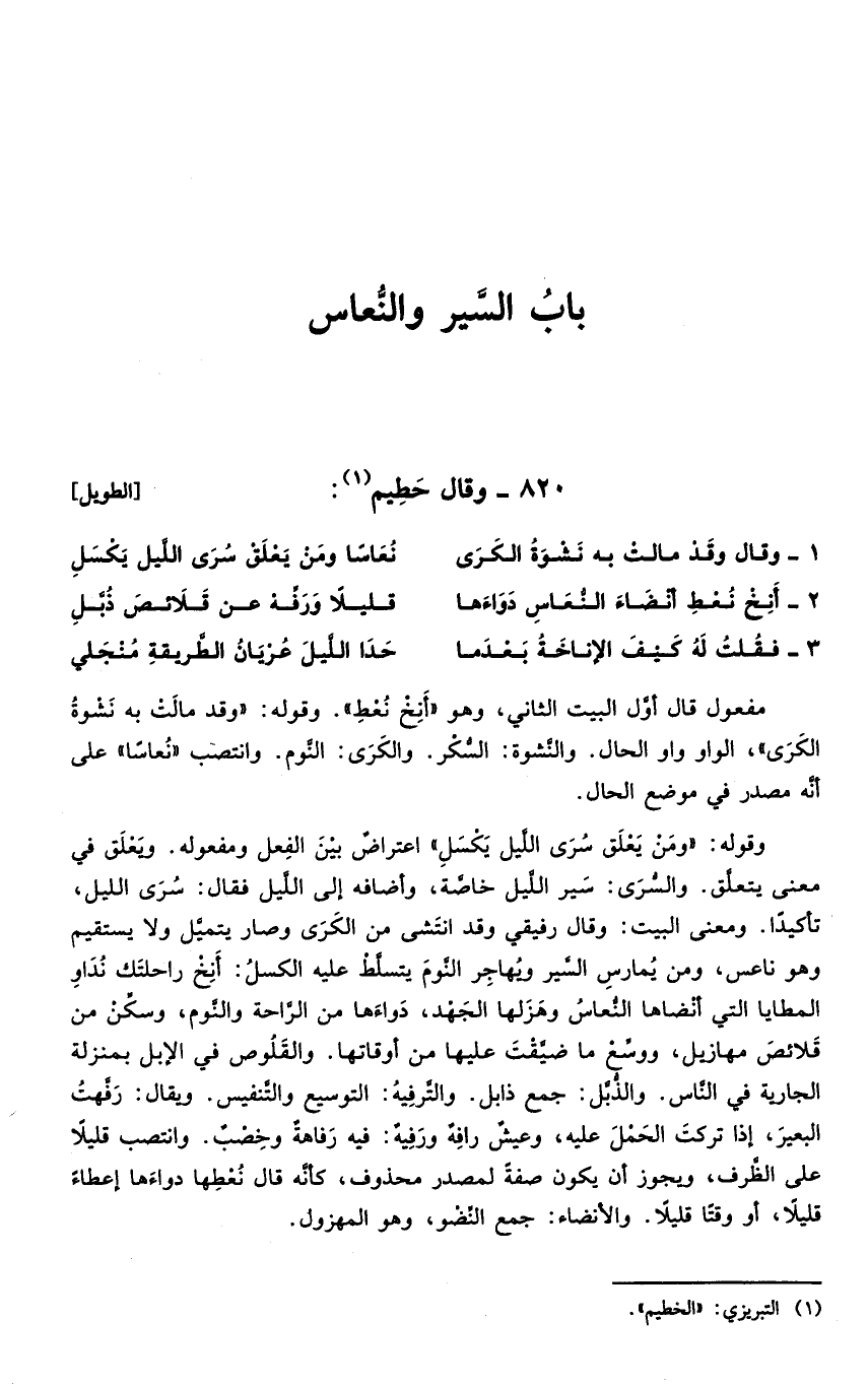 وقوله " ومن يعلق سرى الليل يكسل " اعتراض بين الفعل ومفعوله. ويعلق في معنى يتعلق. والسرى: سير الليل خاصة، وأضافه إلى الليل فقال سرى الليل، تأكيداً. ومعنى البيت: وقال رفيقي وقد انتشى من الكرى وصار يتميل ولا يستقيم وهو ناعس، ومن يمارس السير ويهاجر النوم يتسلط عليه الكسل: أنخ راحلتك نداو المطايا التي أنضاها النعاس وهزلها الجهد، دواءها من الراحة والنوم، وسكن من قلائص مهازيل، ووسع ما ضيقت عليها من أوقاتها. والقلوص في الإبل بمنزلة الجارية في الناس. والذبل: جمع ذابل. والترفيه: التوسيع والتنفيس. ويقال: رفهت البعير، إذا تركت الحمل عليه، وعيشٌ رافهٌ ورفيهٌ: فيه رفاهةٌ وخصبٌ. وانتصب قليلاً على الظرف، ويجوز أن يكون صفة لمصدر محذوف، كأنه قال نعطها دواءها إعطاء قليلاً، أو وقتاً قليلاً. والأنضاء: جمع النضو، وهو المهزول.