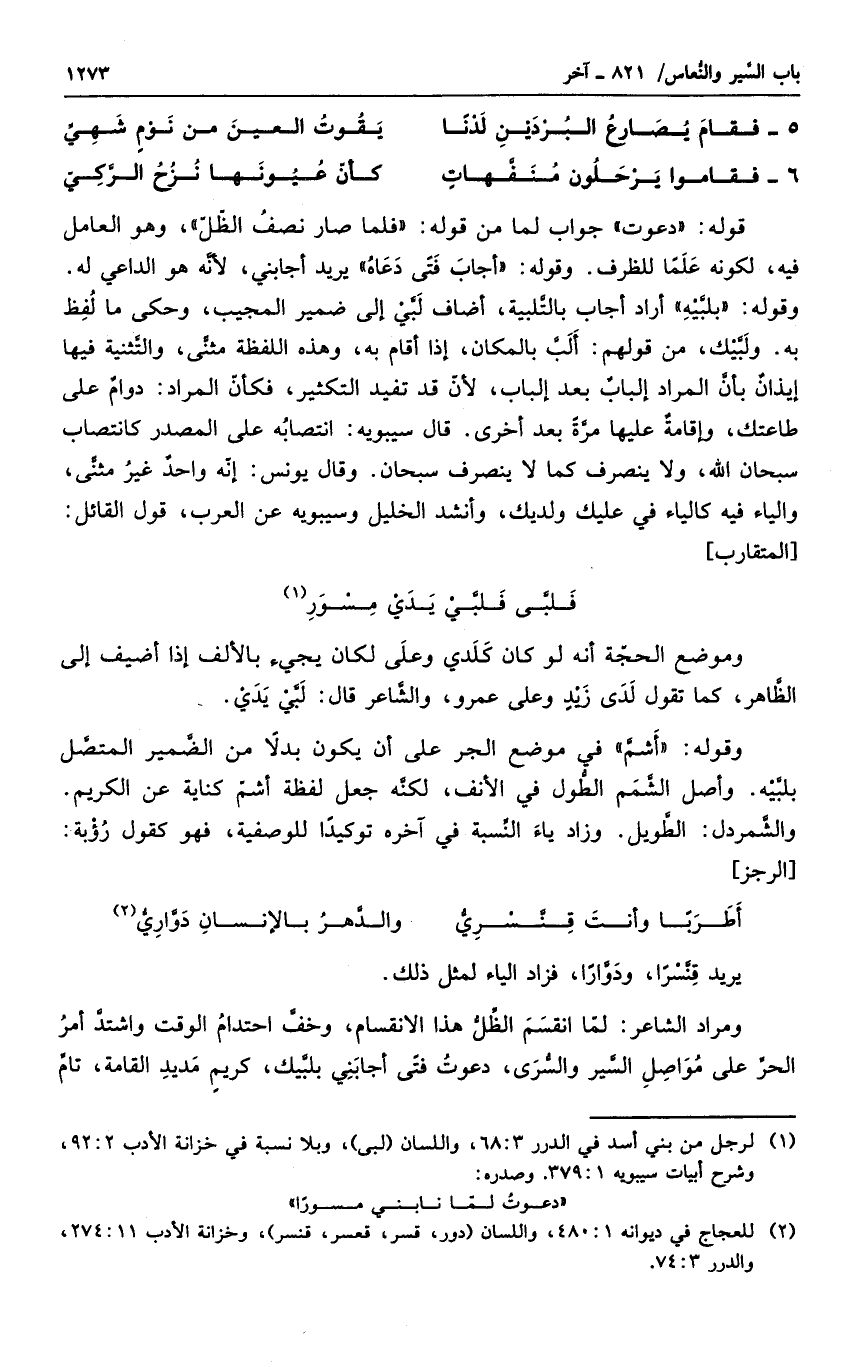 قوله " دعوت " جواب لما من قوله " فلما صار نصف الظل "، وهو العامل فيه، لكونه علماً للظرف. وقوله " أجاب فتى دعاه " يريد أجابني، لأنه هو الداعي له. وقوله " بلبيه " أراد أجاب بالتلبية، أضاف لبي إلى ضمير المجيب، وحكى ما لفظ به. ولبيك، من قولهم: ألب بالمكان، إذا أقام به، وهذه اللفظة مثنى، والتثنية فيها إيذانٌ بأن المراد إلبابٌ بعد إلباب، لأن قد تفيد التكثير، فكأن المراد: دوامٌ على طاعتك، وإقامة عليها مرة بعد آخرى. قال سيبويه: انتصابه على المصدر كانتصاب سبحان الله، ولا ينصرف كما لا ينصرف سبحان. وقال يونس: إنه واحدٌ غير مثنى، والياء فيه كالياء في عليك ولديك، وأنشد الخليل وسيبويه عن العرب، قول القائل: