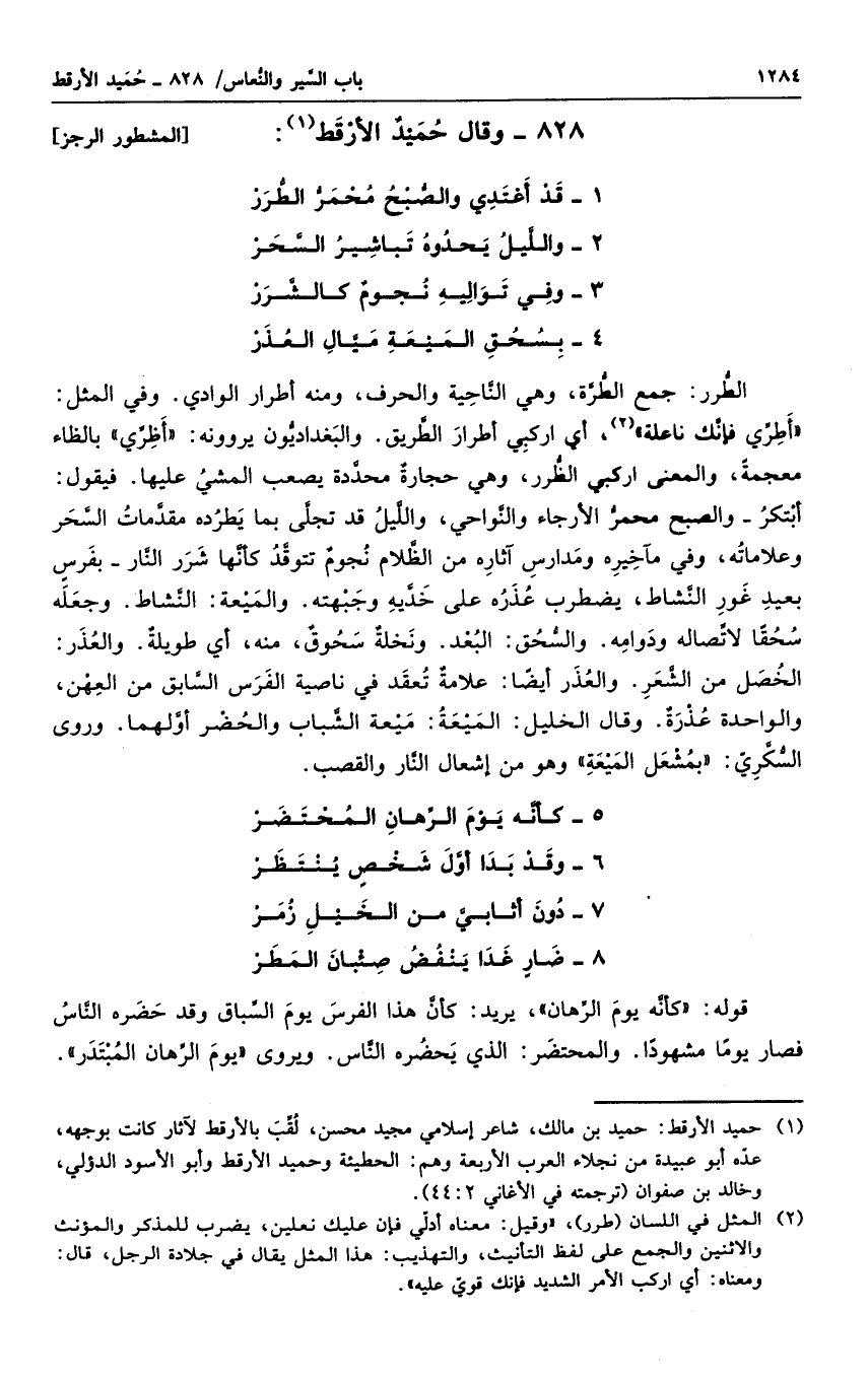 الطرر: جمع الطرة، وهي الناحية والحرف، ومنه أطرار الوادي. وفي المثل: " أطري فإنك ناعلة "، أي أركبي أطرار الطريق. والبغداديون يروونه: " أظري " بالظاء معجمةً، والمعنى أركبي الظرر، وهي حجارةٌ محددة يصعب المشي عليها. فيقول: أبتكر - والصبح محمرٌ الأرجاء والنواحي، والليل قد تجلى بما يطرده مقدمات السحر وعلاماته، وفي مآخيره ومدارس آثاره من الظلام نجومٌ تتوقد كأنها شرر النار - بفرسٍبعيد غور النشاط، يضطرب عذره على خديه وجبهته. والميعة: النشاط. وجعله سحقاً لاتصاله ودوامه. والسحق: البعد. ونخلةٌ سحوقٌ، منه، أي طويلةٌ. والعذر: الخصل من الشعر. والعذر أيضاً: علامةٌ تعقد في ناصية الفرس السابق من العهن، والواحدة عذرةٌ. وقال الخليل: الميعة: ميعة الشباب والحضرأولهما. وروى السكري: " بمشعل الميعة " وهو من إشعال النار والقصب.