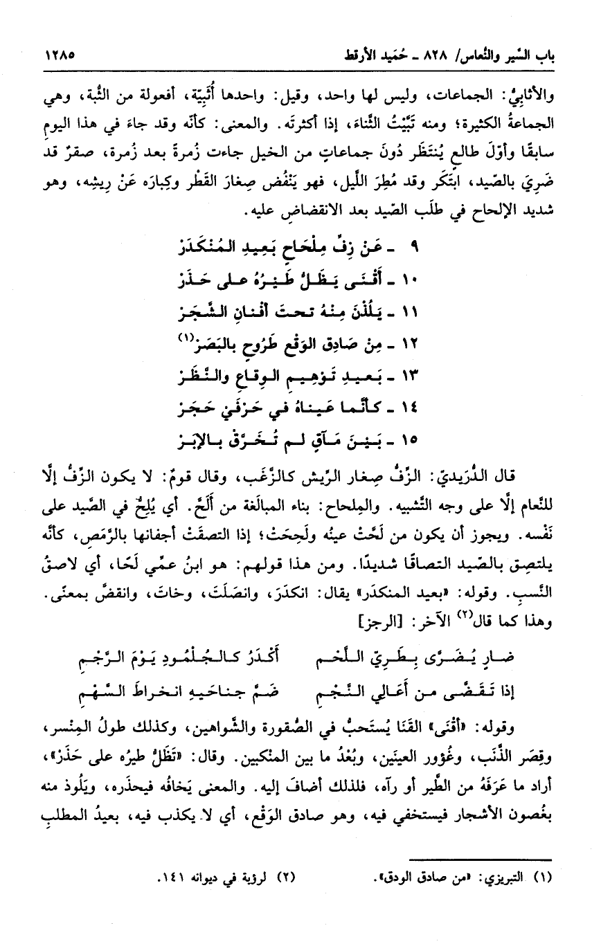وقوله " أقتى " القنا يستحب في الصقورة والشواهين، وكذلك طول المنسر، وقصر الذنب، وغوؤر العينين، وبعد ما بين المنكبين. وقال " تظل طيره على حذر "، أراد ما عرفه من الطير أو رآه، فلذلك أضاف إليه. والمعنى يخافه فيحذره، ويلوذ منه بغصون الأشجار فيستخفي فيه، وهو صادق الوقع، أي لا يكذب فيه، بعيد المطلب