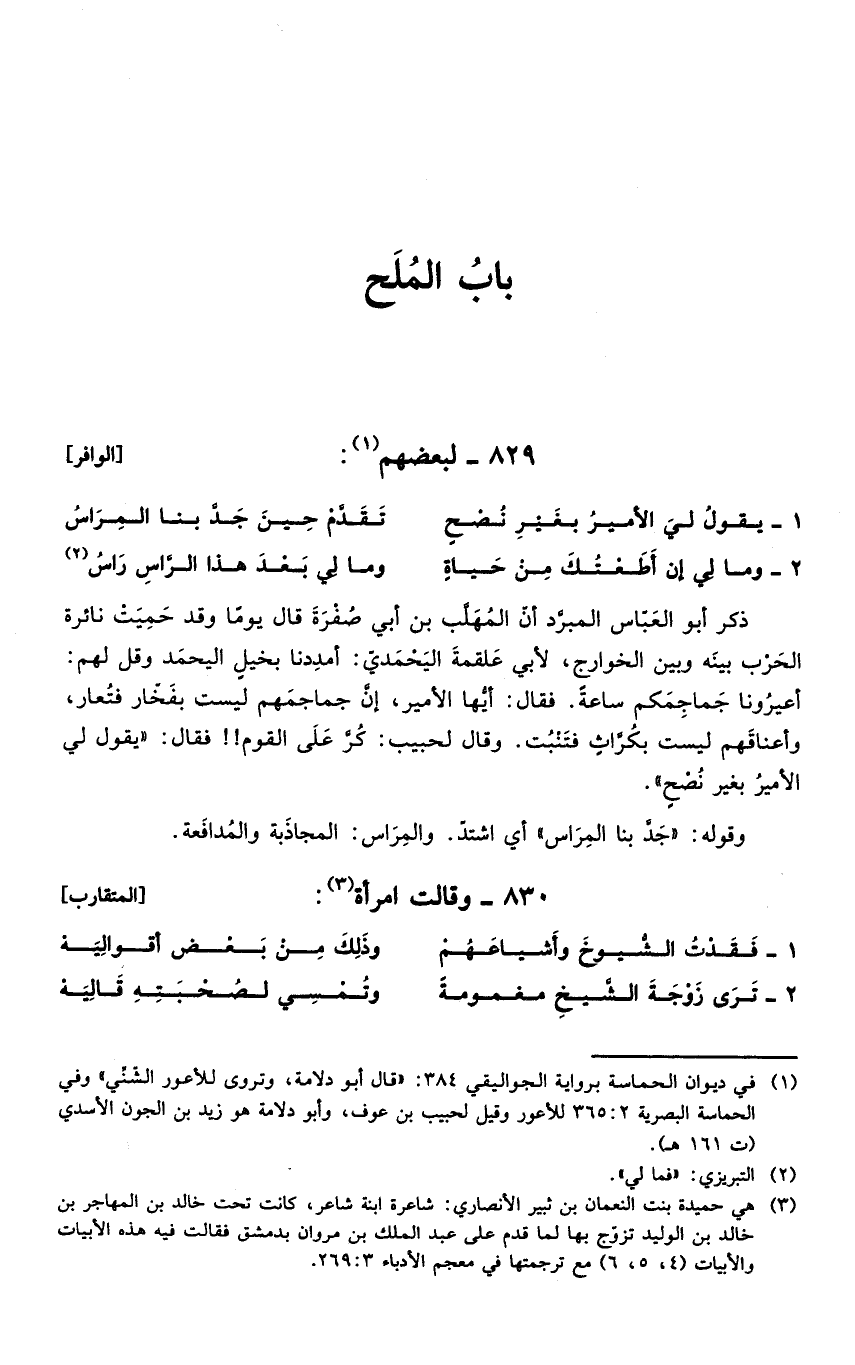 ذكر أبو العباس المبردأن المهلب بن أبي صفرة قال يوماً وقد حميت نائرة الحرب بينه وبين الخوارج، لأبي علقمة اليحمدي: أمددنا بخيل اليحمد وقل لهم: أعيرنا جماجمكم ساعةً. فقال: أيها الأمير، إن جماجمهم ليست بفخار فتعار، وأعناقهم ليست بكراثٍ فتنبت. وقال لحبيبكر على القوم!! فقال: " يقول لي الأمير بغير نصحٍ ".