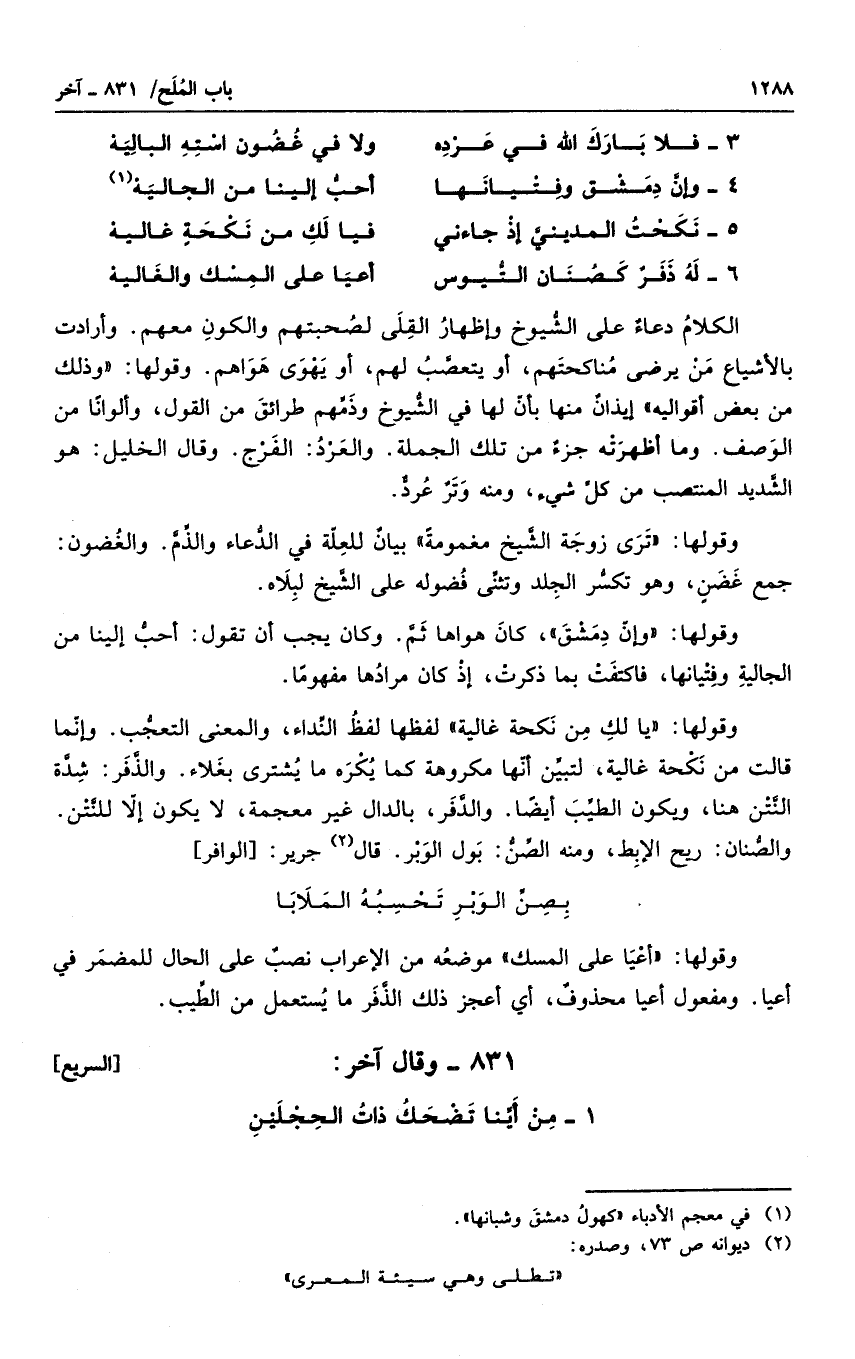 وقولها " وإن دمشق "، كان هواها ثم. وكان يجب أن تقول: أحب إلينا من الجالية وفتيانها، فاكتفت بما ذكرت، إذ كان مرادها مفهوماً.