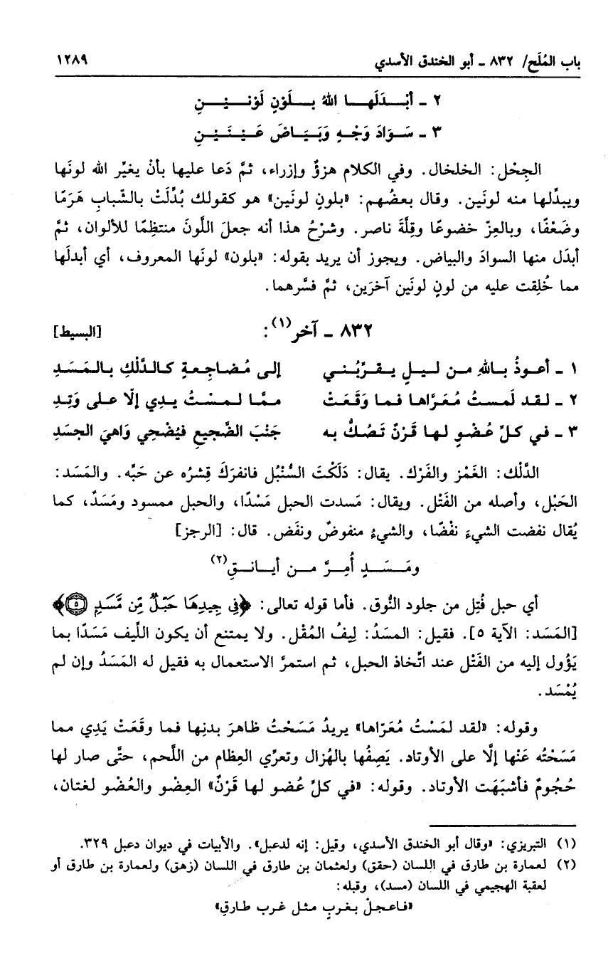 أي حبل فتل من جلود النوق. فأما قوله تعالى: " في جيدها حبلٌ من مسد ". فقيل: المسد ليف المقل. ولا يمتنع أن يكون الليف مسداً بما يؤول إليه من الفتل عند اتخاذ الحبل، ثم استمر الاستعمال به فقيل له المسد وإن لم يمسد.