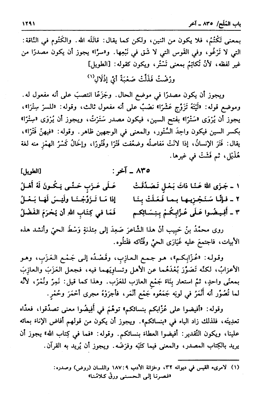 وقوله " أفيضوا على عزابكم بنسائكم " توهم في أفيضوا معنى تصدقوا، فعداه تعديته، فلذلك زاد الباء في " بنسائكم ". ويجوز أن يكون من قولهم أفاض الإناء بمائه علينا، ويكون التقدير: أفيضوا العطاء بنسائكم. وقوله " فما في كتاب الله " يجوز أن يريد بالكتاب المصدر، والمعنى فيما كتبه وفرضه. ويجوز أن يريد به القرآن.