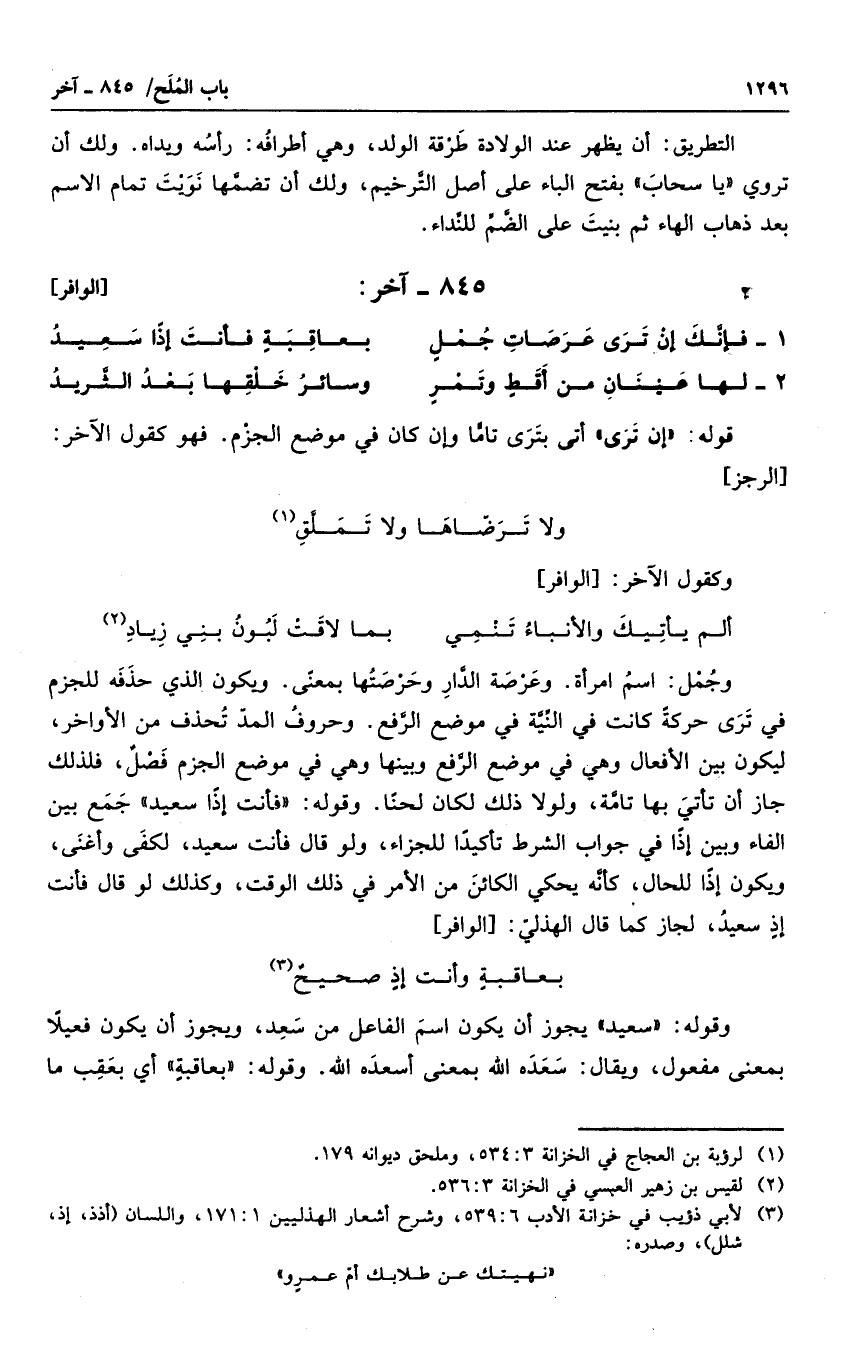 وجمل: اسم امرأة. وعرصة الدار وحرصتها بمعنى. ويكون الذى حذفه للجزم فى ترى حركة كانت فى النية فى موضع الرفع. وحروف المد تحذف من الأواخر، ليكون بين الأفعال وهى فى موضع الرفع وبينها وهى فى موضع الجزم فصل، فلذلك جاز أن تأتى بها تامة، ولولا ذلك لكان لحنا. وقوله " فأنت إذا سعيد " جمع بين الفاء وبين إذا فى جواب الشرط تأكيدا للجزاء، ولو قال فأنت سعيد، لكفى وأغنى، ويكون إذا للحال، كأنه يحكى الكائن من الأمر فى ذلك الوقت، وكذلك لو قال فأنت إذ سعيد، لجاز كما قال الهذلى: