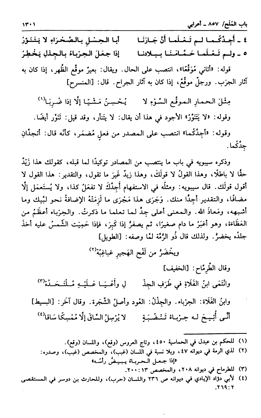 وذكره سيبويه فى باب ما ينتصب من المصادر توكيداً لما قبله، كقولك هذا زيدٌ حقاً لا باطلاً، وهذا القول لا قولك، وهذا زيدٌ غير ما تقول، والتقدير: هذا القول لا أقول قولك. قال سيبويه: ومثله في الاستفهام أجدك لا تفعل كذا، ولا يستعمل إلا مضافاً، والتقدير أجداً لك. وجرى هذا مجرى ما لزمته الإضافة نحو لبيك وما أشبهه، ومعاذ الله. والمعنى أعلى جدٍ لم تعلما ما ذكرت. والحرباء أعظم من العظاءة، وهو أغبر ما دام صغيراً، ثم يصفر إذا كبر، فإذا حميت الشمس عليه أخذ جلده يخضر. ولذلك قال ذو الرمة لما وصفه: