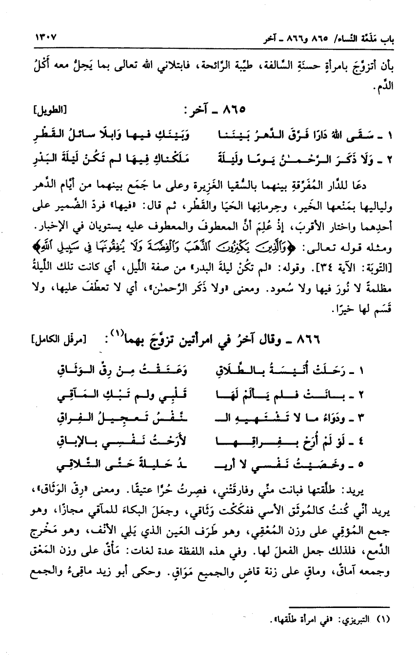 يريد: طلقتها فبانت مني وفارقتني، فصرت حراً عتيقاً. ومعنى " رق الوثاق "، يريد أني كنت كالموثق الأسير ففككت وثاقي، وجعل البكاء للمآقي مجازاً، وهو جمع المؤقي على وزن المعقي، وهو طرف العين الذي يلي الأنف، وهو مخرج الدمع، فلذلك جعل الفعل لها. وفي هذه اللفظة عدة لغات: مأقٌ على وزن المعق وجمعه آماقٌ، وماقٍ على زنة قاضٍ والجميع مواقٍ. وحكى أبو زيد ماقئٌ والجمع