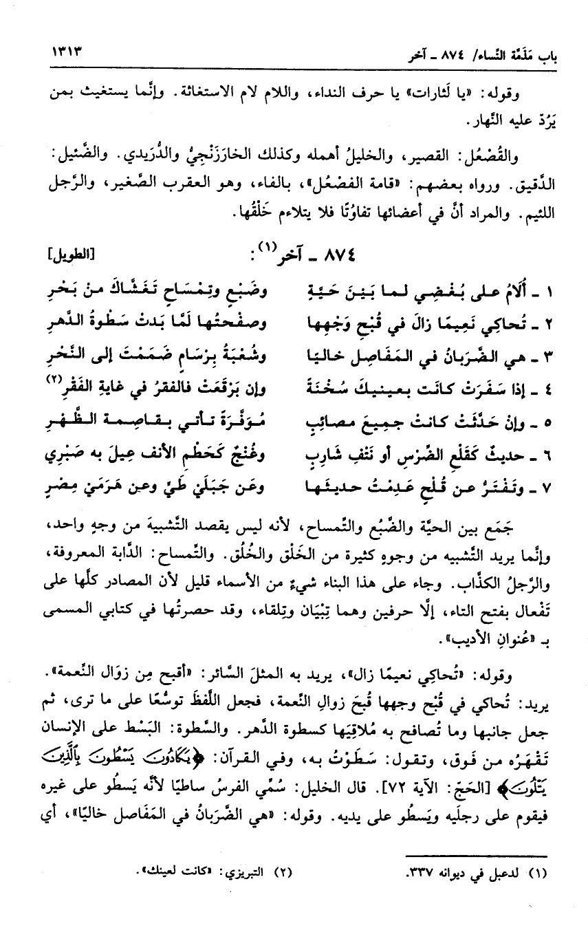 جمع بين الحية والضبع والتمساح، لأنه ليس يقصد التشبيه من وجهٍ واحد، وإنما يريد التشبيه من وجوهٍ كثيرة من الخلق والخُلُق. والتمساح: الدابة المعروفة، والرجل الكذاب. وجاء على هذا البناء شيءٌ من الأسماء قليل لأن المصادر كلها على تفعال بفتح التاء، إلا حرفين وهما تبيان وتلقاء، وقد حصرتها في كتابي المسمى ب " عنوان الأديب ".