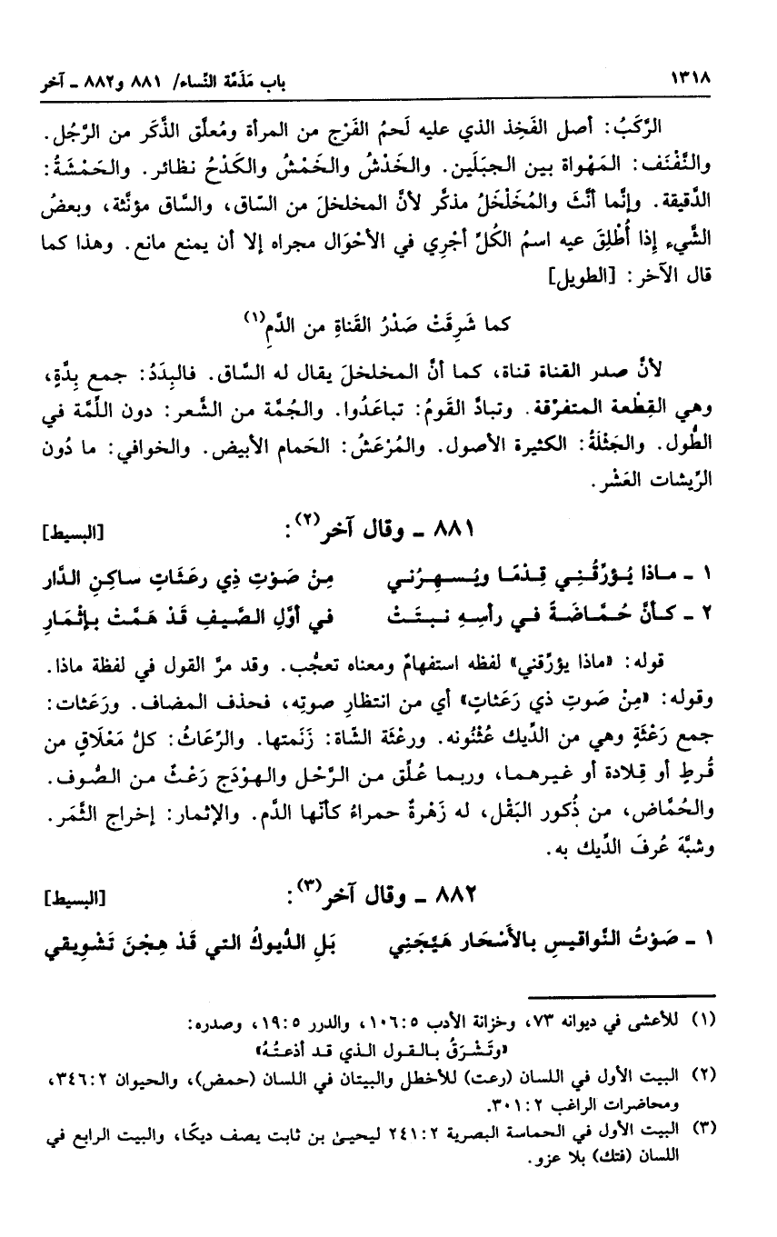 قوله " ماذا يؤرقني " لفظه استفهامٌ ومعناه تعجب. وقد مر القول في لفظه ماذا. وقوله " من صوت ذي رعثاتٍ " أي من انتظار صوته، فحذف المضاف. ورعثات: جمع رعثةٍ وهي من الديك عثنونه. ورعثة الشاة: زنمتها. والرعاث: كل معلاقٍ من قرطٍ أو قلادة أو غيرهما، وربما علق من الرحل والهودج رعثٌ من الصوف. والحماض، من ذكور البقل، له زهرةٌ حمراء كأنها الدم. والإثمار: إخراج الثمر. وشبه عرف الديك به.