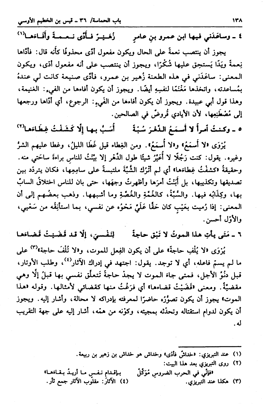 يجوز أن ينتصب نعمةً على الحال ويكون مفعول أدى محذوفاً كأنه قال: فأداها نعمةً ويداً يستحق عليها شكراً، ويجوز أن ينتصب على أنه مفعول أدى، ويكون المعنى: ساعدني في هذه الطعنة زهير بن عمرو، فأدى صنيعة كانت لي عنده بمساعدته، واتخذها مغنماً لنفسه أيضاً. ويجوز أن يكون أفاءها من الفيء: الغنيمة، وهذا قول أبي عبيدة. ويجوز أن يكون أفاءها من الفئ: الرجوع، أي أداها ورجعها إلى مصطنعها، لأن الأيادي قروضٌ في الصالحين.