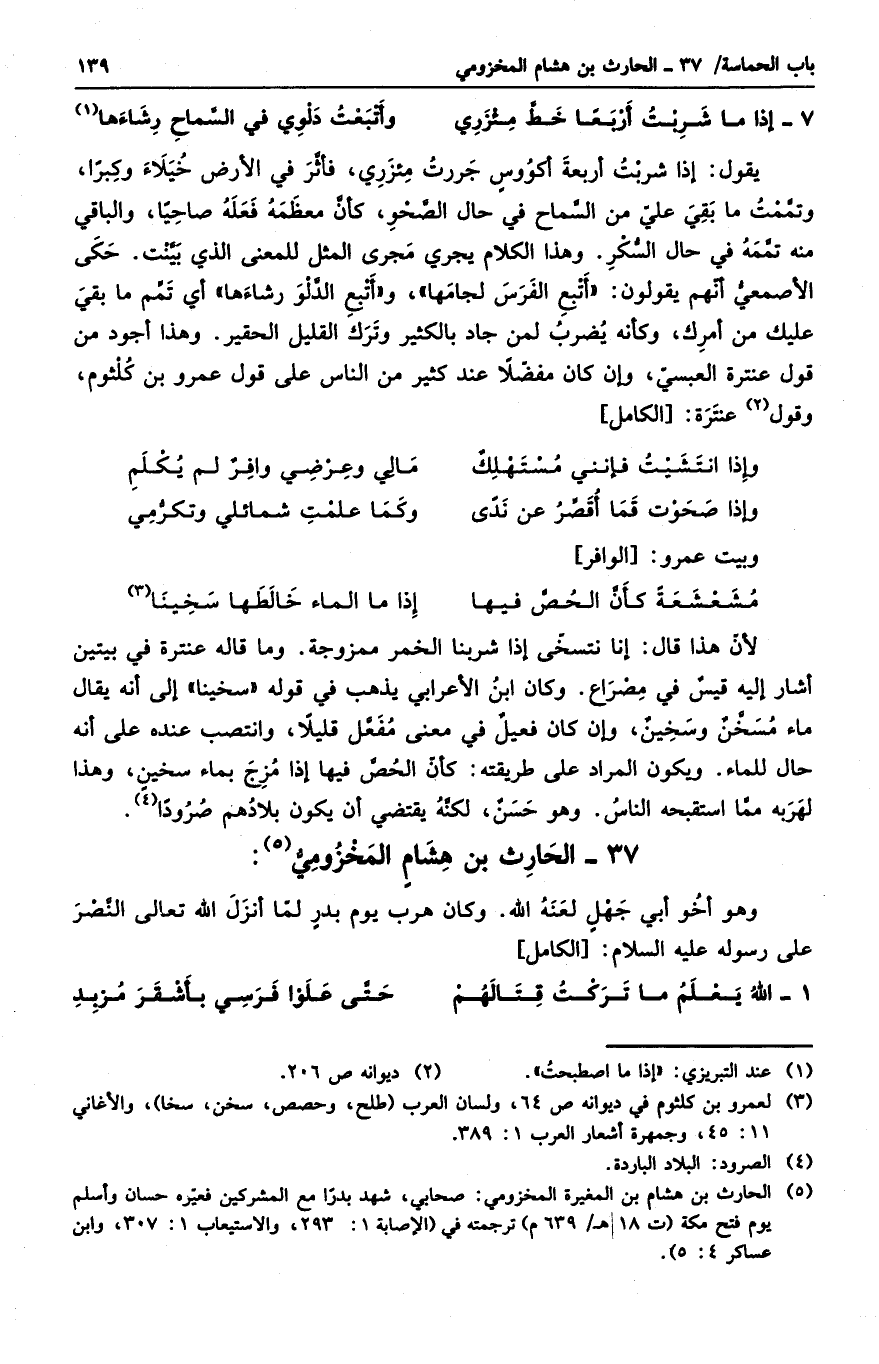 يقول: إذا شربت أربعة أكؤسٍ جررت مئزري، فأثر في الأرض خيلاء وكبراً، وتممت ما بقي علي من السماح في حال الصحو، كأن معظمه فعله صاحياً، والباقي منه تممه في حال السكر. وهذا الكلام يجري مجرى المثل للمعنى الذي بينت. حكى الأصمعي أنهم يقولون: أتبع الفرس لجامها، وأتبع الدلو رشاءها، أي تمم ما بقي عليك من أمرك. وكأنه يضرب لمن جاد بالكثير وترك القليل الحقير. وهذا أجود من قول عنترة العبسي، وإن كان مفضلاً عند كثير من الناس على قول عمرو بن كلثوم، وقول عنترة: