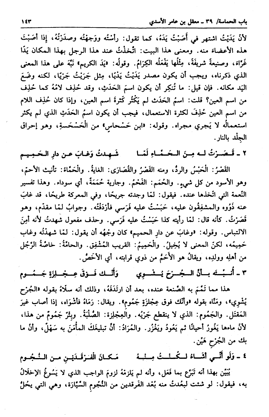 لأن يديت اشتهر في أصبت يده، كما تقول: رأسته ووجهته وصدرته، إذا أصبت هذه الأعضاء منه. ومعنى هذا البيت: اتخذت عند هذا الرجل بهذا المكان يداً غراء، وصنيعةً شريفةً، مثلها يفعله الكرام. وقوله: يد الكريم نبه على هذا المعنى الذي ذكرناه، ويجب أن يكون مصدر يديت يدياً، مثل جريت جرياً، لكنه وضع اليد مكانه. فإن قيلك ما تنكر أن يكون اسم الحدث، وقد حذف لامه كما حذف من اسم العين؟ قلت: اسم الحدث لم يكثر كثرة اسم العين، وإذا كان حذف اللام من اسم العين حذف لكثرة الاستعمال، فيجب أن يكون اسم الحدث الذي لم يكثر استعماله لا يجري مجراه. وقوله: ابن حسحاسٍ من الحسحسة، وهو إحراق الجلد بالنار.