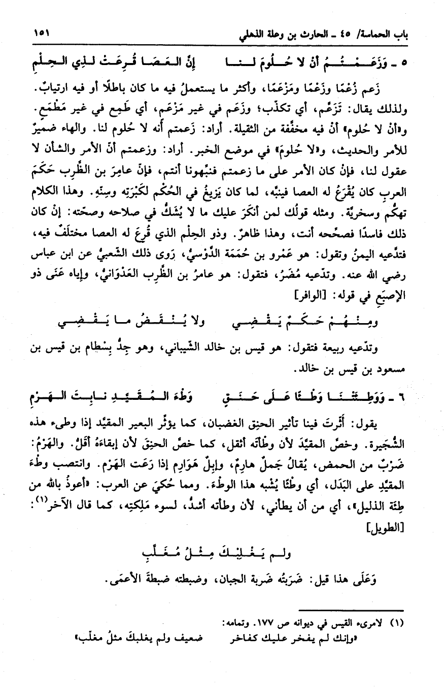 زعم زعماً وزعماً ومزعماً، وأكثر ما يستعمل فيه ما كان باطلاً أو فيه ارتيابٌ. ولذلك يقال: تزعم، أي تكذب؛ وزعم في غير مزعمٍ، أي طمع في مطمعٍ. وأن لا حلوم أن فيه مخففة من الثقيلة. أراد: زعمتم أنه لا حلوم لنا. والهاء ضميرٌ للأمر والحديث، ولا حلوم في موضع الخبر. أراد: وزعمتم أن الأمر والشأن لا عقول لنا، فإن كان الأمر على ما زعمتم فنبهونا أنتم، فإن عامر بن الظرب حكم العرب كان يقرع له العصا فينبه، لما كان يزيغ في الحكم لكبرته وسنه. وهذا الكلام تهكم وسخرية. ومثله قولك لمن أنكر عليك ما لا يشك في صلاحه وصحته: إن كان ذلك فاسداً فصححه أنت. وهذا ظاهرٌ. وذو الحلم الذي قرع له العصا مختلفٌ فيه، فتدعيه اليمن وتقول: هو عمرو بن حممة الدوسي، روى ذلك الشعبي عن ابن عباس رضي الله عنه. وتدعيه مضر، فتقول: هو عامر بن الظرب العدواني، وإياه عنى ذو الإصبع في قوله: