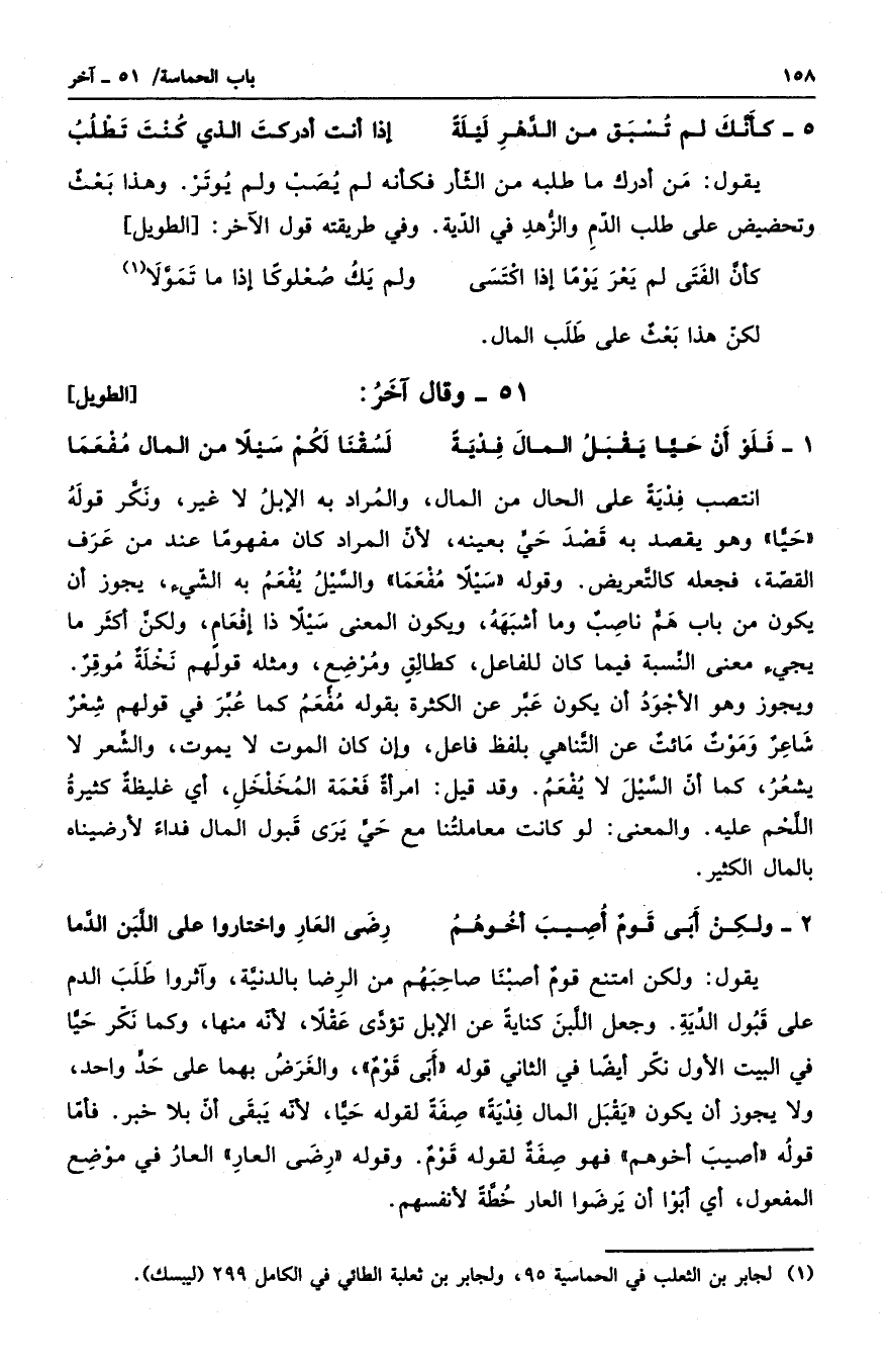 يقول: ولكن امتنع قومٌ أصبنا صاحبهم من الرضا بالدنية، وآثروا طلب الدم على قبول الدية. وجعل اللبن كنايةً عن الإبل تؤدي عقلاً، لأنه منها، وكما نكر حياً في البيت الأول نكر أيضاً في الثاني قوله أبى قومٌ، والغرض بهما على حدٍ واحد، ولا يجوز أن يكون يقبل المال فديةٌ صفة لقوله حيا، لأنه يبقى أن بلا خبر. فأما قوله أصيب أخوهم فهو صفةٌ لقوله قومٌ. وقوله رضى العار العار في موضع المفعول، أي أبوا أن يرضوا العار خطةً لأنفسهم.