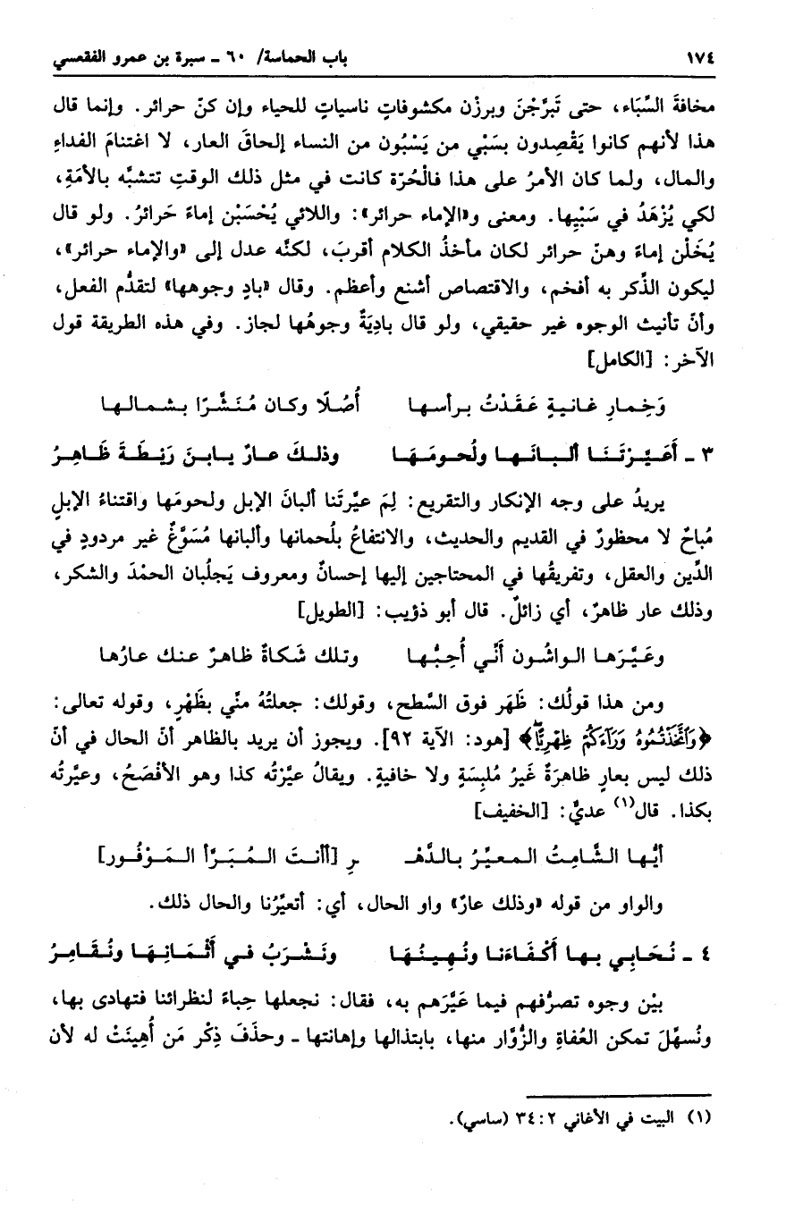 يريد على وجه الإنكار والتقريع: لم عيرتنا ألبان الإبل ولحومها واقتناء الإبل مباحٌ لا محظورٌ في القديم والحديث، والانتفاع بلحمانها وألبانها مسوغٌ غير مردودٍ في الدين والعقل، وتفريقها في المحتاجين إليها إحسانٌ ومعروف يجلبان الحمد والشكر. وذلك عار ظاهرٌ، أي زائلٌ. قال أبو ذؤيب: