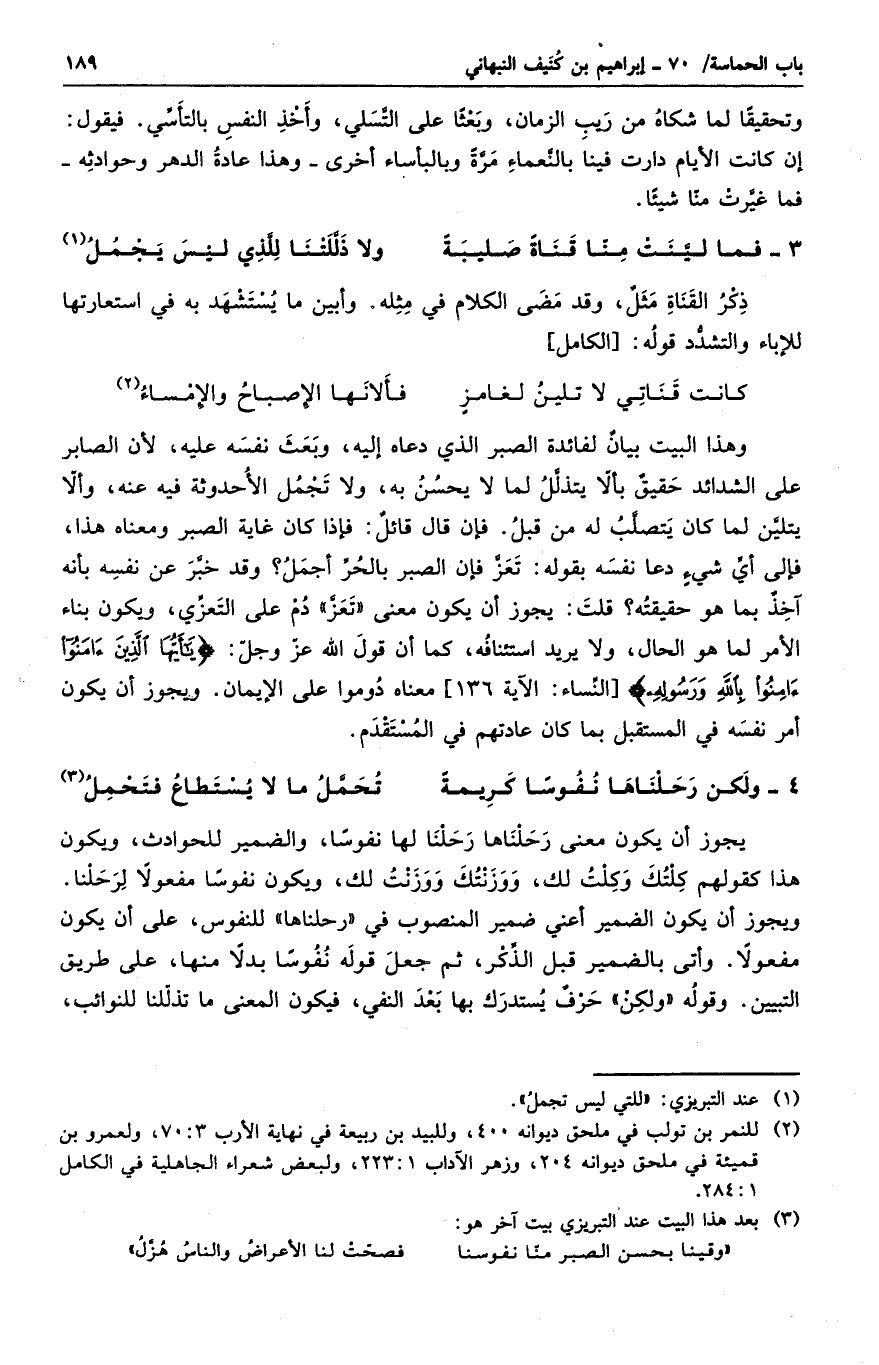 وهذا البيت بيانٌ لفائدة الصبر الذي دعاه إليه، وبعث نفسه عليه، لأن الصابر على الشدائد حقيق بألا يتذلل لما لا يحسن به، ولا تجمل الأحدوثة فيه عنه، وألا يتلين لما كان يتصلب له من قبل. فإن قال قائلٌ: فإذا كان غاية الصبر ومعناه هذا، فإلى أي شيء دعا نفسه بقوله: تعز فإن الصبر بالحر أجمل؟ وقد خبر عن نفسه بأنه آخذ بما هو حقيقته؟ قلت: يجوز أن يكون معنى " تعز " دم على التعزي، ويكون بناء الأمر لما هو الحال، ولا يريد استئنافه، كما أن قول الله عز وجل: " يا أيها الذين آمنوا آمنوا بالله ورسوله " معناه دوموا على الإيمان. ويجوز أن يكون أمر نفسه في المستقبل بما كان عادتهم في المستقدم.