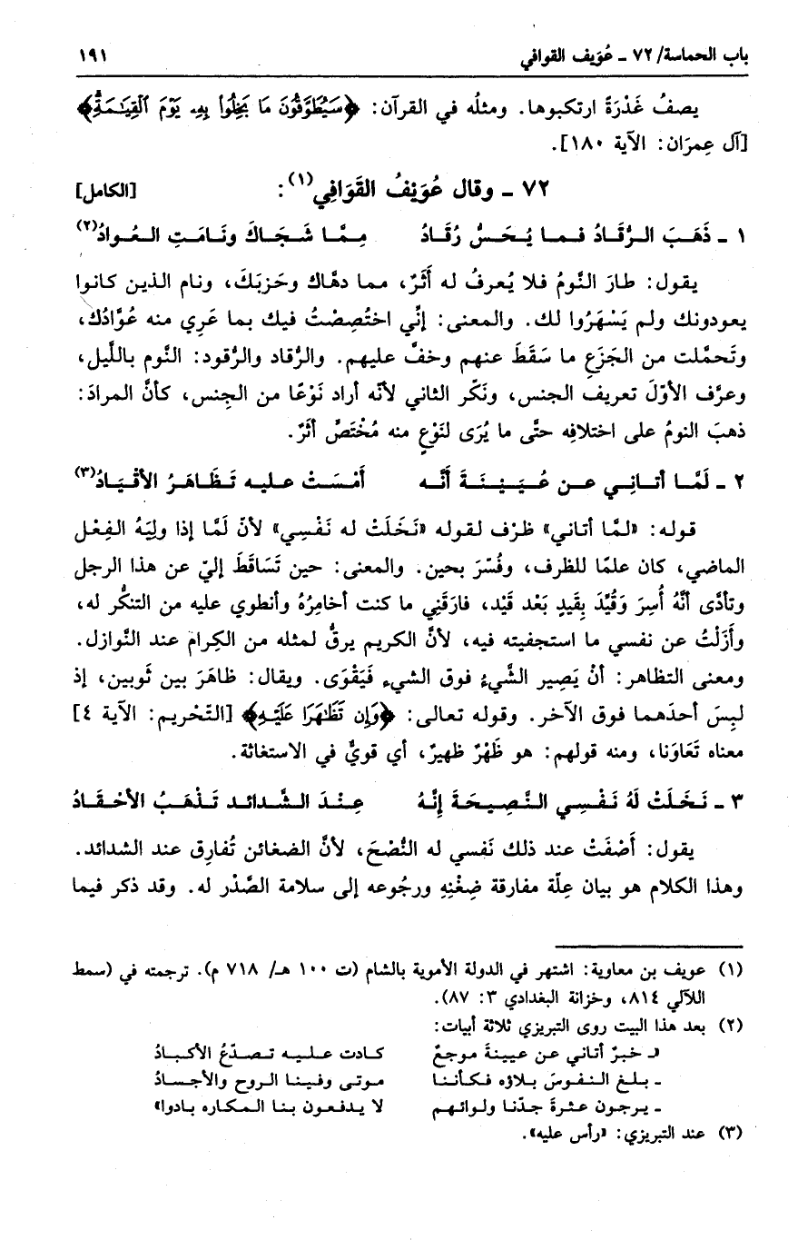 قوله " لما أتاني " ظرف لقوله " نخلت له نفسي " لن لما إذا وليه الفعل الماضي، كان علماً للظرف، وفسر بحين. والمعنى: حين تساقط إلى عن هذا الرجل وتأدى أنه أسر وقيد بقيدٍ بعد قيد، فارقني ما كنت أخامره وأنطوي عليه من التنكر له، وأزلت عن نفسي ما استجفيته فيه، لأن الكريم يرق لمثله من الكرام عند النوازل. ومعنى التظاهر: أن يصير الشيء فوق الشيء فيقوى. ويقال: ظاهر بين ثوبين، إذ لبس أحدهما فوق الآخر. وقوله تعالى: " وإن تظاهرا عليه " معناه تعاونا، ومنه قولهم: هو ظهرٌ ظهيرٌ، أي قويٌ في الاستغاثة.