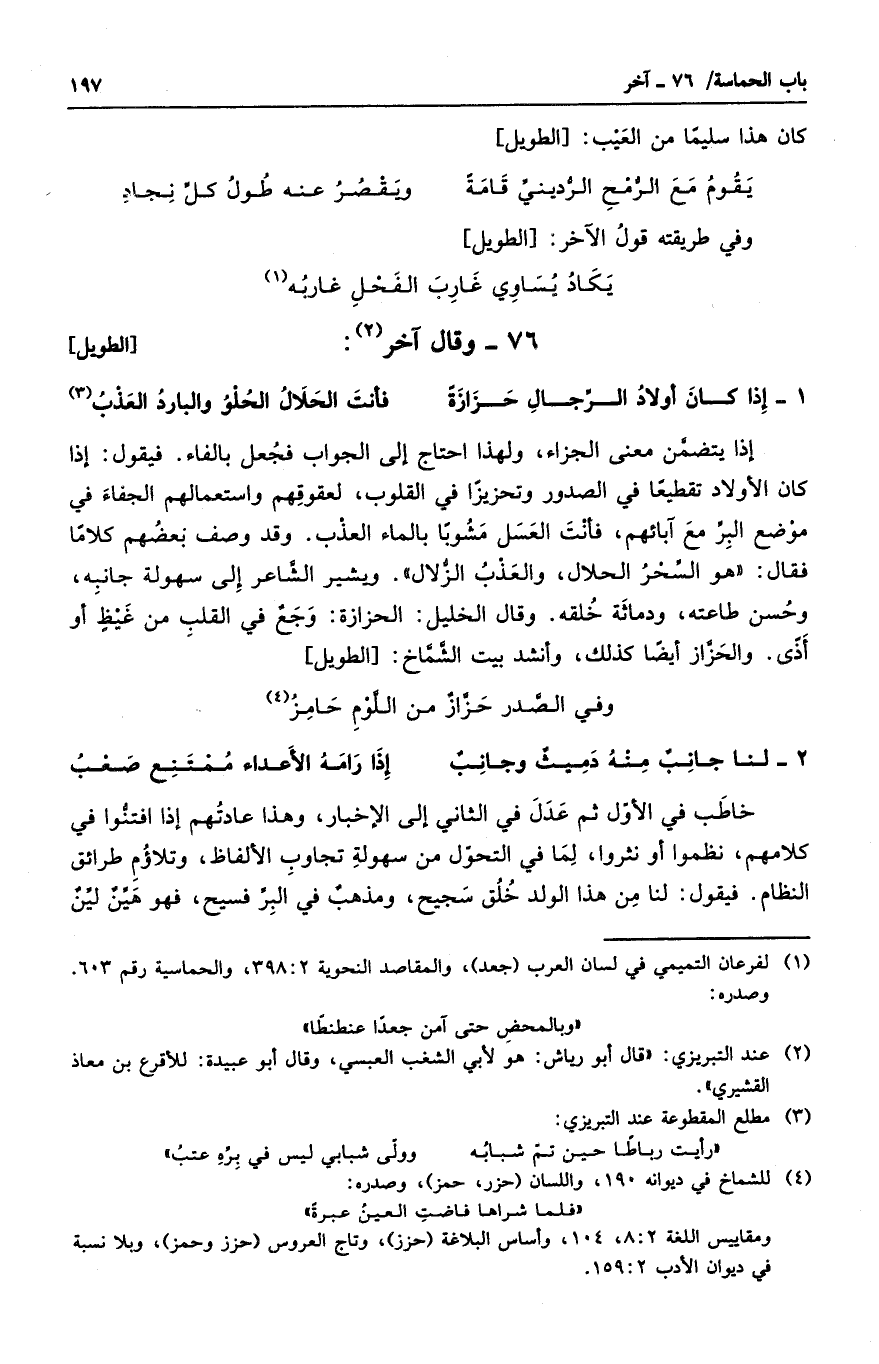 إذا يتضمن معنى الجزاء، ولهذا احتاج إلى الجواب فجعل بالفاء. فيقول: إذا كان الأولاد تقطيعاً في الصدور وتحزيزاً في القلوب، لعقوقهم واستعمالهم الجفاء في موضع البر مع آبائهم، فأنت العسل مشوباً بالماء العذب. وقد وصف بعضهم كلاماً فقال: " هو السحر الحلال، والعذب الزلال ". ويشير الشاعر إلى سهولة جانبه، وحسن طاعته، ودماثة خلقه. وقال الخليل: الحزازة: وجعٌ في القلب من غيظٍ أو أذًى. والحزاز أيضاً كذلك، وأنشد بيت الشماخ: