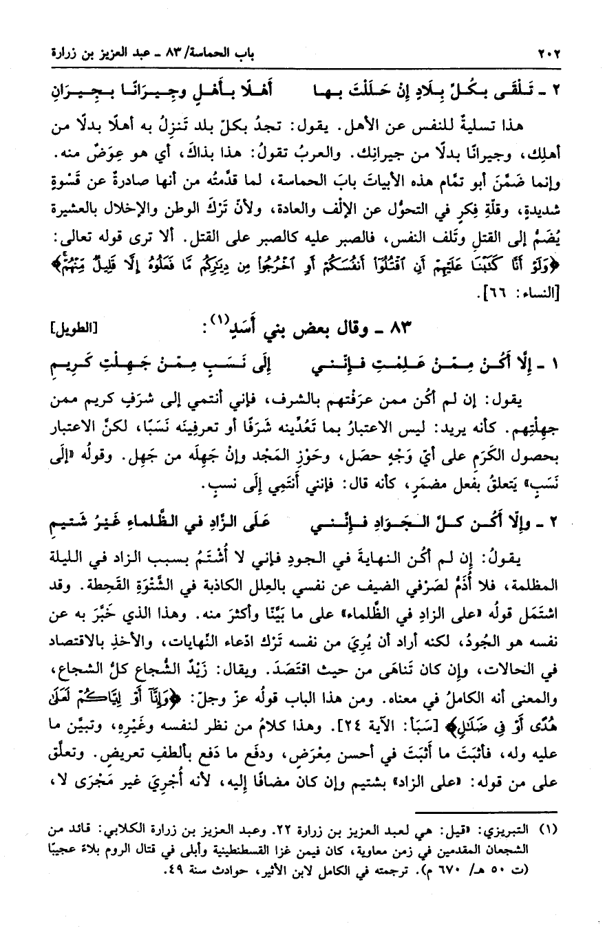 هذا تسليةٌ للنفس عن الأهل. يقول: تجد بكل بلد تنزل به أهلاً بدلاً من أهلك، وجيراناً بدلاً من جيرانك. والعرب تقول: هذا بذاك، أي هو عوضٌ منه. وإنما ضمن أبو تمام هذه الأبيات باب الحماسة، لما قدمته من أنها صادرةٌ عن قسوةٍ شديدةٍ، وقلة فكرٍ في التحول عن الإلف والعادة، ولأن ترك الوطن والإحلال بالعشيرة يضم إلى القتل وتلف النفس، فالصبر عليه كالصبر على القتل. ألا ترى قوله تعالى: " ولو أنا كتبنا عليهم أن اقتلوا أنفسكم أو اخرجوا من دياركم ما فعلوه إلا قليلٌ منهم ".