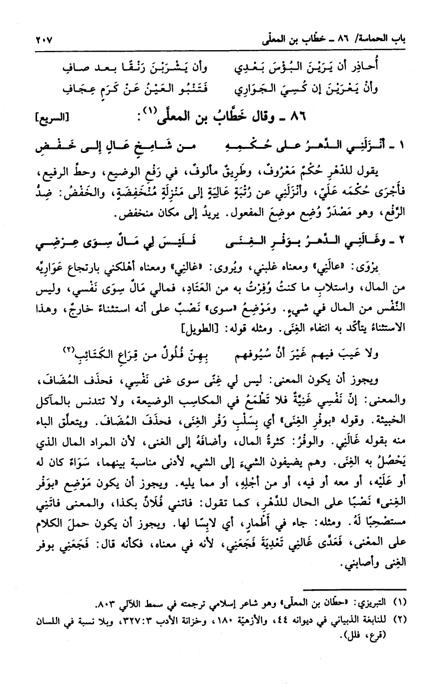 يروى: عالني ومعناه غلبني، ويروى: غالني ومعناه أهلكني بارتجاع عواريه من المال، واستلاب ما كنت وفرت به من العتاد، فمالي مالٌ سوى نفسي، وليس النفس من المال في شيءٍ. وموضع سوى نصبٌ على أنه استثناءٌ خارجٌ، وهذا الاستثناء يتأكد به انتفاء الغنى. ومثله قوله: