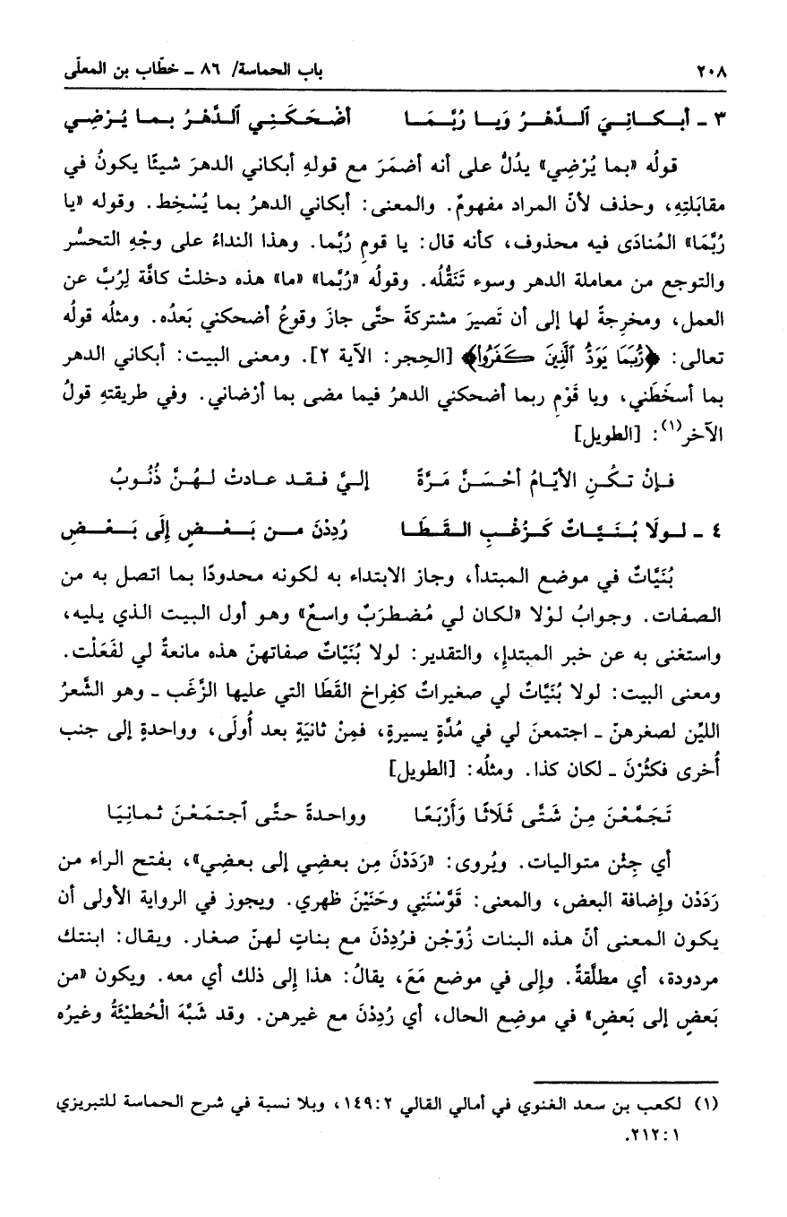 قوله بما يرضي يدل على أنه أضمر مع قوله أبكاني الدهر شيئاً يكون في مقابلته، وحذف لأن المراد مفهومٌ. والمعنى أبكاني الدهر بما يسخط. وقوله يا ربما المنادى فيه محذوف، كأنه قال: يا قوم ربما. وهذا النداء على وجه التحسر والتوجع من معاملة الدهر وسوء تنقله. وقوله ربما ما هذه دخلت كافة لرب العمل، ومخرجه لها إلى أن تصير مشتركة حتى جاز وقوع أضحكني بعده. ومثله قوله تعالى: " ربما يود الذين كفروا ". ومعنى البيت: أبكاني الدهر بما أسخطني، ويا قوم ربما أضحكني الدهر فيما مضى بما أرضاني. وفي طريقته قول الآخر: