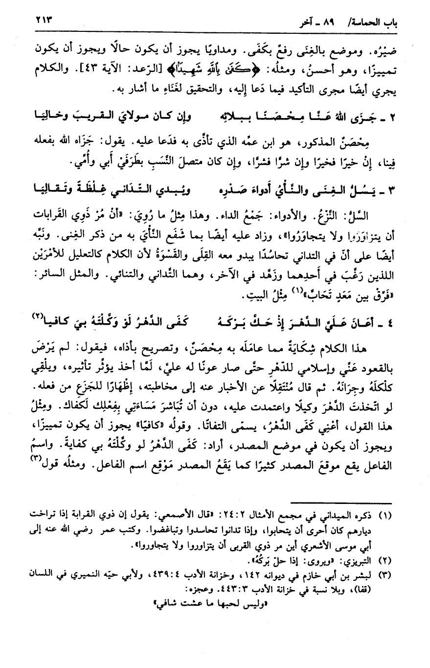 هذا الكلام شكايةٌ مما عامله به محصنٌ، وتصريح بأذاه، فيقول: لم يرض بالقعود عني وإسلامي للدهر حتى صار عوناً له علي، لما أخذ يؤثر تأثيره، ويلقي كلكله وجرانه. ثم قال منتقلاً عن الأخبار عنه إلي مخاطبته، وإظهاراً للجزع من فعله. لو اتخذت الدهر وكيلاً واعتمدت عليه، دون أن تباشر مساءتي بفعلك لكفاك. ومثل هذا القول، أعني كفى الدهر، يسمى التفاتاً. وقوله كافياً يجوز أن يكون تمييزاً، ويجوز أن يكون في موضع المصدر، أراد: كفى الدهر لو وكلته بي كفايةً. واسم الفاعل يقع موقع موقع المصدر كثيراً كما يقع المصدر موقع اسم الفاعل. ومثله قول