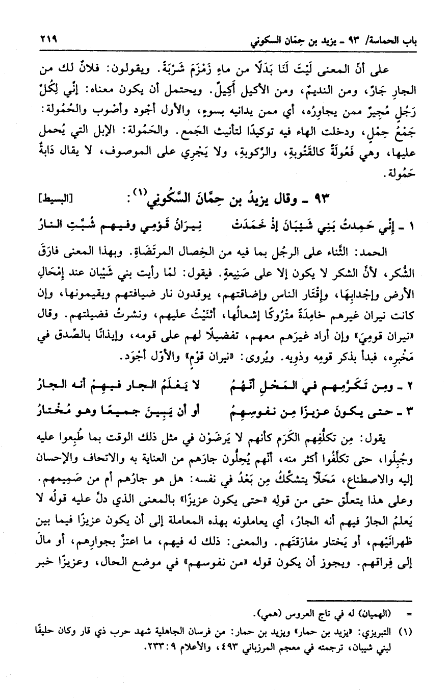 الحمد: الثناء على الرجل بما فيه من الخصال المرتضاة. وبهذا المعنى فارق الشكر، لأن الشكر لا يكون إلا على صنيعة. فيقول: لما رأيت بني شيبان عند إمحال الأرض وإجدابها، وإقتار الناس وإضاقتهم، ويوقدون نار ضيافتهم ويقيمونها، وإن كانت نيران غيرهم خامدة متروكاً إشعالها، أثنيت عليهم، ونشرت فضيلتهم. وقال نيران قومي وإن أراد غيرهم معهم، تفضيلاً لهم على قومه، وإيذاناً بالصدق في مخبره، فبدأ بذكر قومه وذويه. ويروي: نيران قوم، والأول أجود.