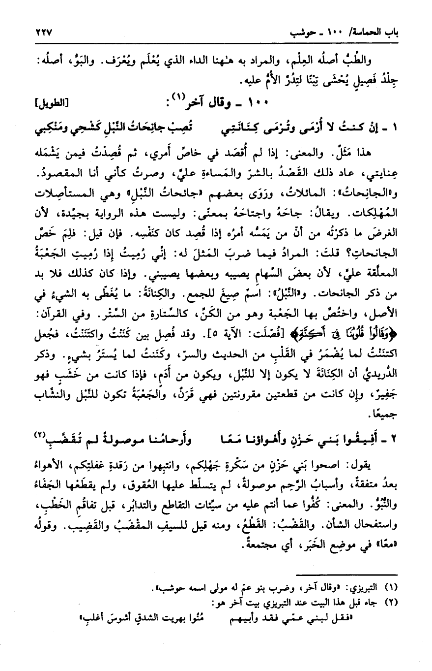 هذا مثلٌ. والمعنى: إذا لم أقصد في خاص أمري، ثم قصدت فيمن يشمله عنايتي، عاد ذلك القصد بالشر والمساءة علي، وصرت كأني أنا المقصود. والجائحات: المائلات، وروى بعضهم جائحات النبل وهي المستأصلات المهلكات. ويقال جاحه واجتاحه بمعنى. وليست هذه الرواية بجيدة، لأن الغرض ما ذكرته من أن من يمسه أمره إذا قصد كان كنفسه. فإن قيل: فلم خص الجانحات؟ قلت: المراد فيما ضرب المثل له: إني رميت إذا رميت الجعبة المعلقة علي، لأن بعض السهام يصيبه وبعضها يصيبني. وإذا كان كذلك فلا بد من ذكر الجانحات. والنبل: اسم صيغ للجمع. والكنانة: ما يغطي به الشيء في الأصل، واختص بها الجعبة وهو من الكن، كالستارة من الستر. وفي القرآن: " وقالوا قولبنا في أكنة ". وقد فصل بين كننت واكتننت، فجعل اكتننت لما يضمر في القلب من الحديث والسر، وكننت لما يستر بشيء. وذكر الدريدي أن الكنانة لا يكون إلا للنبل، ويكون من أدمٍ، فإذا كانت من خشبٍ فهو جفيرٌ، وإن كانت من قطعتين مقرونتين فهي قرنٌ، والجعبة تكون للنبل والنشاب جميعاً.