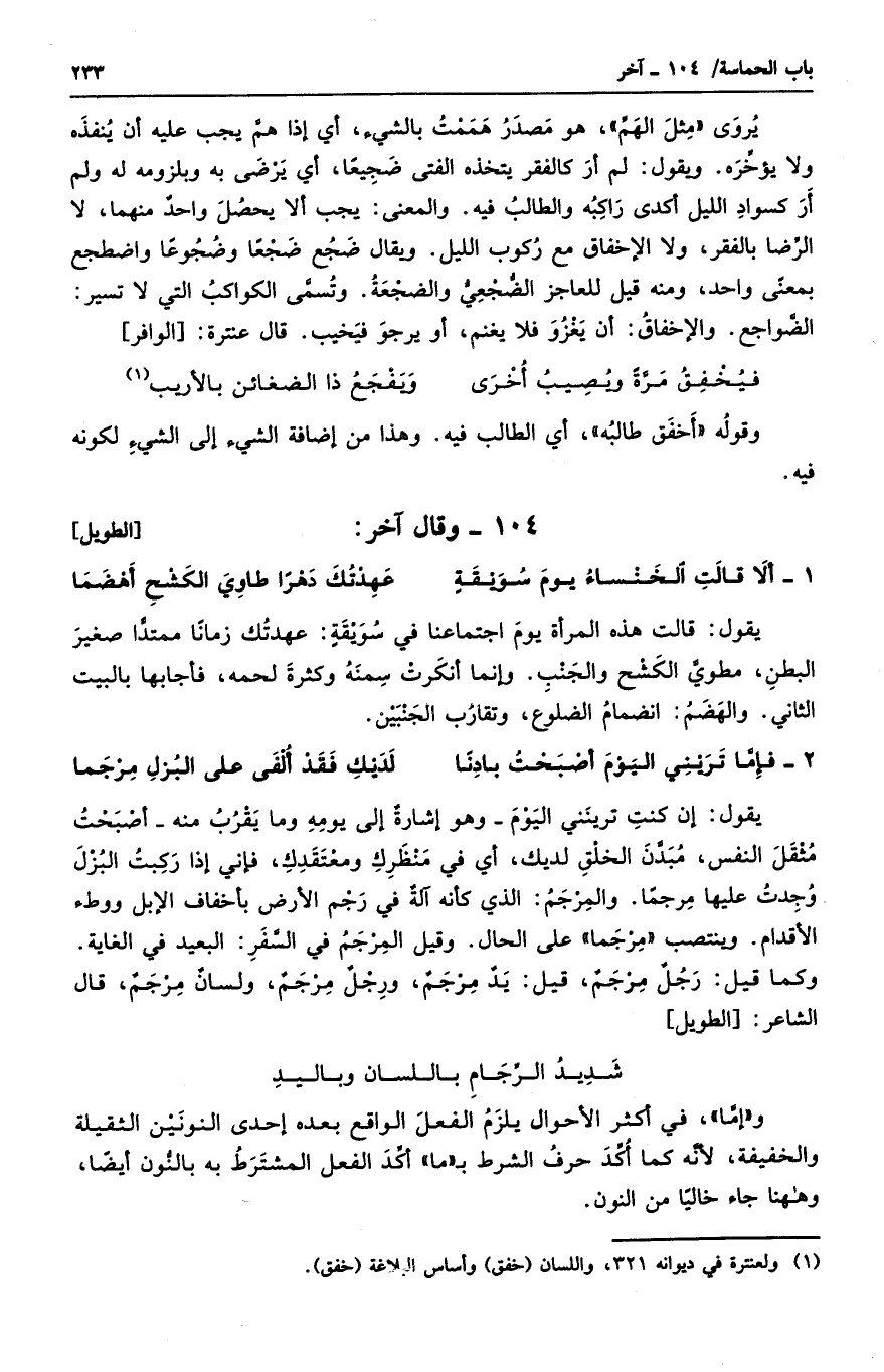 يروى مثل الهم، هو مصدر هممت بالشيء، أي إذا هم يجب عليه أن ينفذه ولا يؤخره. ويقول: لم أر كالفقر يتخذه الفتى ضجيعا، أي يرضى به وبلزومه له ولم أر كسواد الليل أكدى راكبه والطالب فيه. والمعنى: يجب ألا يحصل واحدٌ منهما، لا الرضا بالفقر، ولا الإخفاق مع ركوب الليل. ويقال ضجع ضجعاً وضجوعاً واضطجع بمعنىً واحد، ومنه قيل للعاجز الضجعي والضجعة. وتسمى الكواكب التي لا تسير: الضواجع. والإخفاق: أن يغزو فلا يغنم، أو يرجو فيخيب. قال عنترة:
