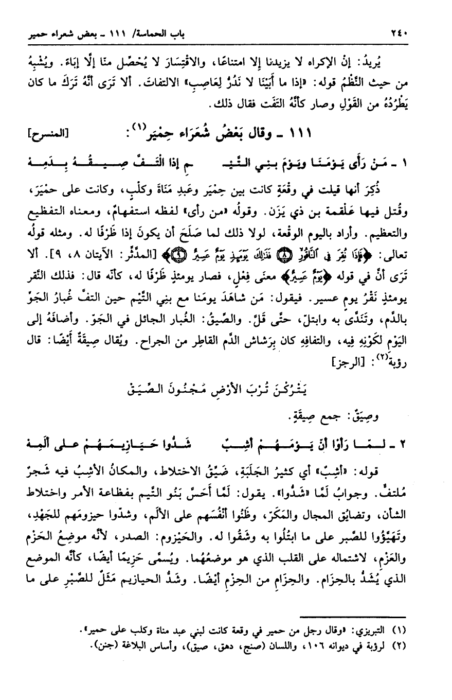 ذكر أنها قيلت في وقعةٍ كانت بين حمير وعبد مناة وكلبٍ، وكانت على حمير، وقتل فيها علقمة بن ذي يزن. وقوله من رأى لفظه استفهامٌ، ومعناه التفظيع والتعظيم. وأراد باليوم الوقعة، لولا ذلك لما صلح أن يكون إذا ظرفاً له. ومثله قوله تعالى: " إذا نقر في الناقور. فذلك يومئذٍ يومٌ عسيرٌ " ألا ترى أن في قوله " يوم عسيرٌ " معنى فعلٍ، فصار يومئذ ظرفاً له، كأنه قال: فذلك النقر يومئذ نقر يومٍ عسير. فيقول: من شاهد يومنا مع بني التيم حين التف غبار الجو بالدم، وتندى به وابتل، حتى قل. والصيق: الغبار الجائل في الجو. وأضافه إلى اليوم لكونه فيه، والتفافه كان برشاش الدم القاطر من الجراح. ويقال صيقهٌ أيضاً: قال رؤية: