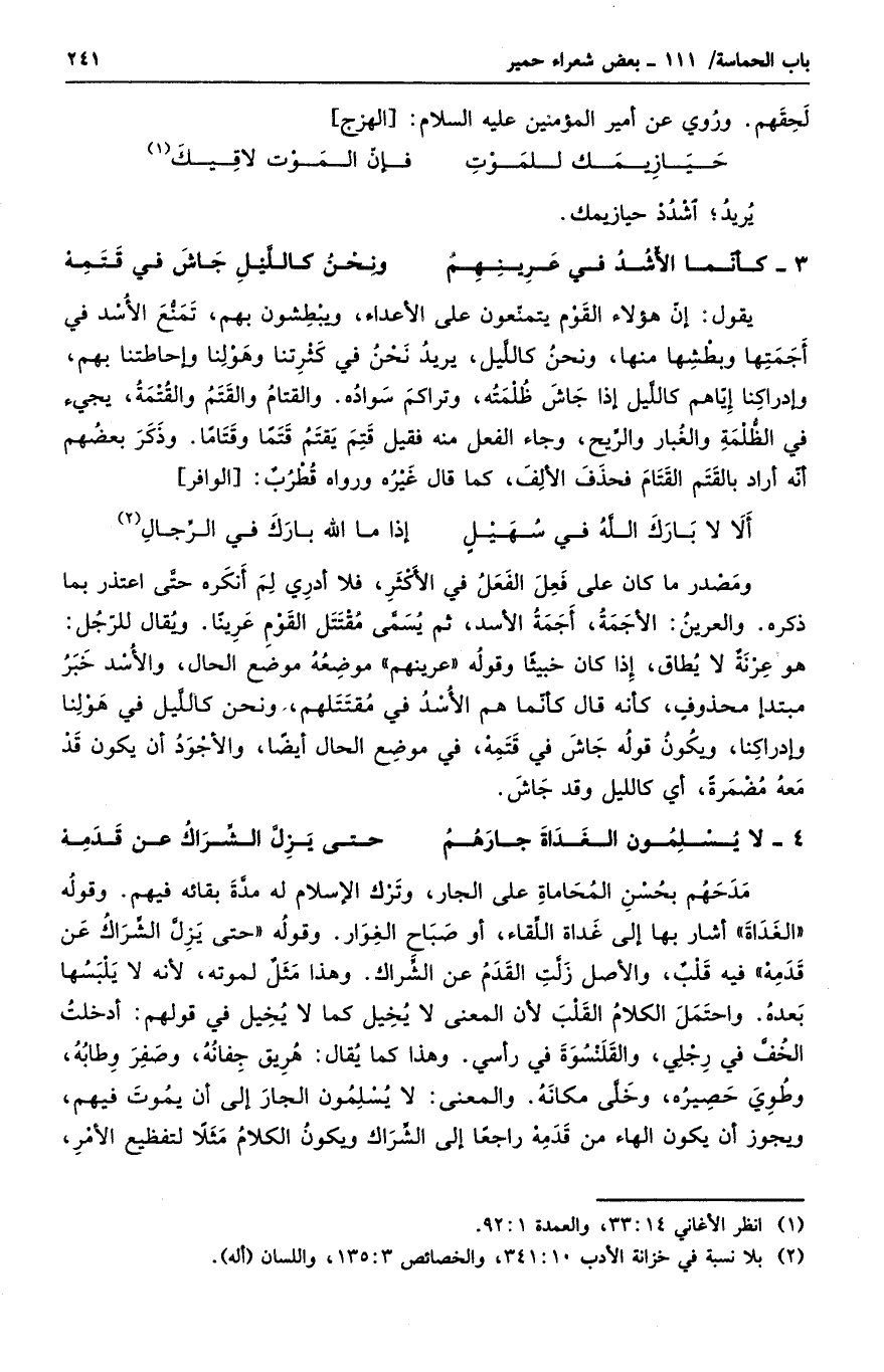 مدحهم بحسن المحاماة على الجار. وترك الإسلام له مدة بقائه فيهم. وقوله الغداة أشار بها إلى غداة اللقاء، أو صباح الغوار. وقوله حتى يزل الشرك عن قدمه فيه قلبٌ، والأصل زلت القدم عن الشراك. وهذا مثلٌ لموته، لأنه لا يلبسها بعده. واحتمل الكلام القلب لأن المعنى لا يخيل كما لا يخيل في قولهم: أدخلت الخف في رجلي، والقلنسوة في رأسي. وهذا كما يقال هريق جفانه، وصفر وطابه، وطوى حصيره، وخلى مكانه. والمعنى لا يسلمون الجار إلى أن يموت فيهم. ويجوز أن يكون الهاء من قدمه راجعاً إلى الشراك ويكون الكلام مثلاً لتفظيع الأمر،