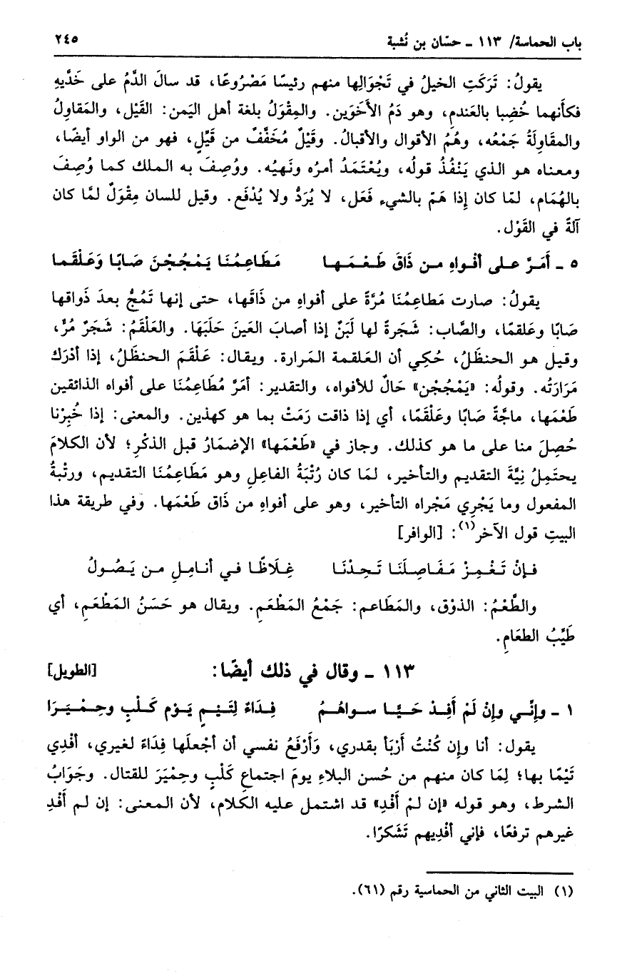 يقول: أنا وإن كنت أربأ بقدري، وأرفع نفسي أن أجعلها فداءً الغيري، أفدي تيماً بها؛ لما كان منهم من حسن البلاء يوم اجتماع كلبٍ وحمير للقتال. وجواب الشرط، وهو قوله " إن لم أفد " قد اشتمل عليه الكلام، لأن المعنى: إن لم أفد غيرهم ترفعاً، فإني أفديهم تشكراً.