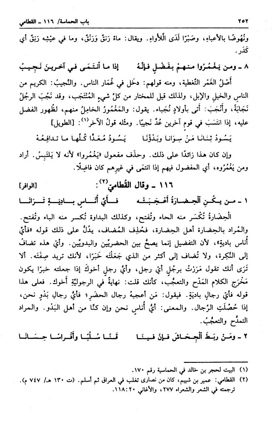 الحضارة تكسر منه الحاء وتفتح، وكذلك البداوة تكسر منه الباء وتفتح. والمراد بالحضارة أهل الحضارة، فحذف المضاف، يدل على ذلك قوله " فأي أناس باديةٍ "، لأن التفضيل إنما يصح بين الحضريين والبدويين. وأي هذه تضاف إلى النكرة، ولا تضاف إلى أكثر من الذي جعلته خبراً، لأنك تريد صفته. ألا ترى أنك تقول مررت برجلٍ أي رجل، وأي رجلٍ أخوك إذا جعلته خبراً يكون مخرج الكلام المدح والتعجب، كأنك قلت: نهايةٌ في الرجولية أخوك. فعلى هذا قوله فأي رجالٍ باديةٍ. فيقول: من أعجبه رجال الحضر؛ فأي رجال بدوٍ نحن، إذا حصلت الرجال. والمعنى: أي أناسٍ نحن وإن كنا من أهل البدو. والمراد التمدح والتعجب.