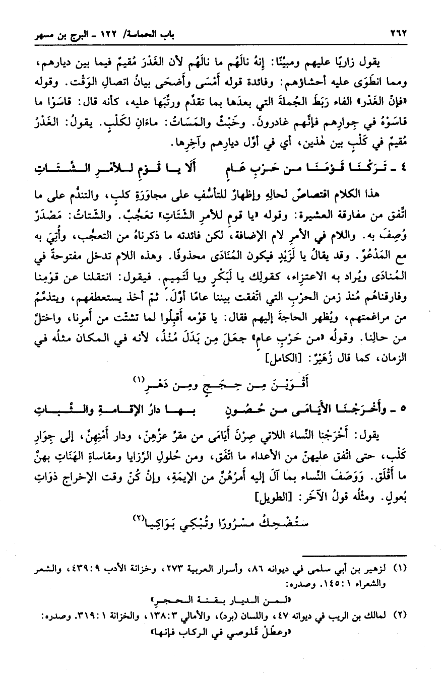 هذا الكلام اقتصاصٌ لحاله، وإظهارٌ للتأسف على مجاورة كلبٍ، والتندم على ما اتفق من مفارقة العشيرة: وقوله " يا قوم للأمر الشتات " تعجبٌ. والشتات: مصدرٌ وصف به. واللام في الأمر لام الإضافة، لكن فائدته ما ذكرناه من التعجب، وأتى به مع المدعو. وقد يقال يا لزيدٍ فيكون المنادى محذوفاَ. وهذه اللام تدخل مفتوحةً في المنادى ويراد به الاعتزاء، كقولك يا لبكرٍ ويا لتميمٍ. فيقول: انتقلنا عن قومنا وفارقناهم منذ زمن الحرب التي اتفقت بيننا عاماً أول. ثم أخذ يستعطفهم، ويتذمم من مراغمتهم، ويظهر الحاجة إليهم فقال: يا قوم أقبلوا لما تشتت من أمرنا، واختل من حالنا. وقوله " من حرب عامٍ " جعل من بدل من، لأنه في المكان مثله في الزمان، كما قال زهيرٌ: