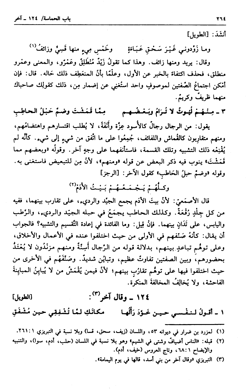 قال الأصمعي: لأن بيت الأدم يجمع الجيد والرديء، على تقارب بينهما، ففيه من كل جلدٍ رقعةٌ. وكذلك الحاطب يجمع في حبله الجيد والرديء، والرطب واليابس، على تدانٍ بينهما. فإن قيل: وما الفائدة في إعادة التقسيم والتشبيه؟ فالجواب أن يقال: كأنه صنفهم في الأولى من حيث اختلفوا عنده في الأعمال والأخلاق، وعلى توهم تباعدٍ بينهم، بدلالة قوله من الرجال أسنةٌ ومنهم مزندون لا يعتد بحضورهم. وبين الصفتين تفاوتٌ عظيم، وتباين شديدٌ. وصنفهم في الأخرى من حيث اختلفوا فيها على توهم تقاربٍ بينهم؛ لأن فيمن يقمش من لا يباين المباينة الفاحشة، ولا يخالف المخالفة المنكرة.