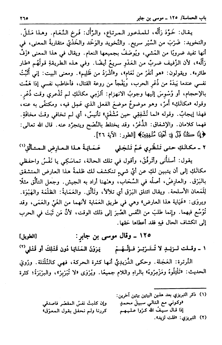 يقال: خود رأله، للمذعور المرتاع: والرأل. فرخ النعام. وهذا مثلٌ. والتخويد: ضربٌ من السير سريع. والتخويد والوخد والخدي متقاربة المعنى، في أنها تفيد ضروباً من المشي، ويوصف بجميعها النعام. ويقال في هذا المعنى " زف رأله "، لأن الزفيف ضربٌ من العدو سريعٌ أيضاً. وفي هذه الطريقة قولهم " طار طائره ". ويقولون: " هو أنفر من نعامٍ "، و " أشرد من ظليم ". ومعنى البيت: إني أثبت نفسي عند ما يبده من ذعر الحرب، ويفجأ من روعة القتال، فأخاطب نفسي إذا همت بالإحجام، أو وسوس إليها وجوب الانهزام: الزمي مكانك لم تذعري وقت ذعرٍ. وقوله " مكانك " أمرٌ، وهو موضوعٌ موضع الفعل الذي عمل فيه، ومكتفىً به عنه، فهذا إيجابٌ. وقوله " لما تشفقي حين مشفق " تأنيسٌ، أي لم تخافي وقت مخافةٍ. فهما كلامان. والإشفاق: الذعر، وقد يختلط بالنصح ويتجرد عنه. قال الله تعالى: " إنا كنا قبل في أهلنا مشفقين ".