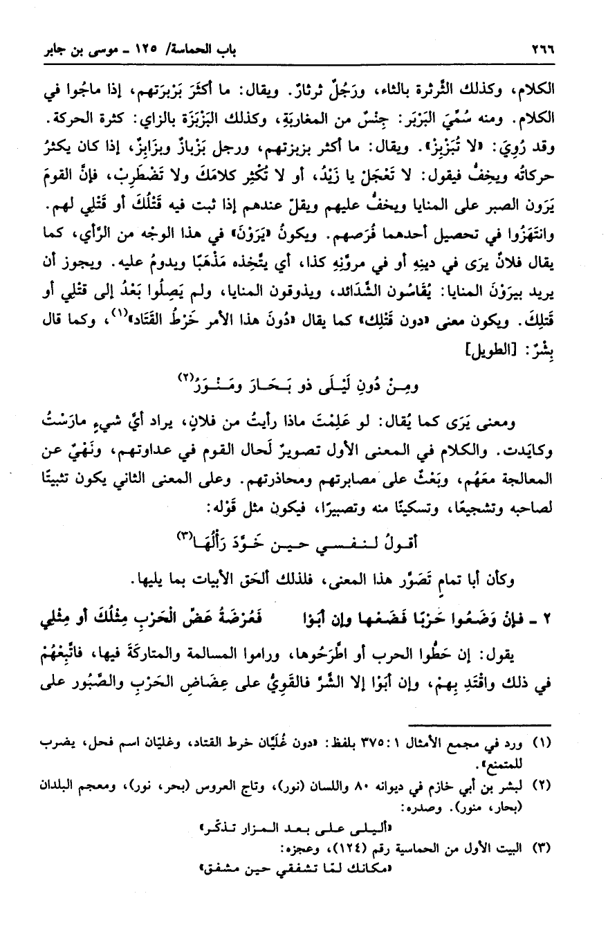 الكلام، وكذلك الثرثرة بالثاء، ورجلٌ ثرثارٌ. ويقال: ما أكثر بربرتهم، إذا ماجوا في الكلام. ومنه سمي البربر: جنس من المغاربة، وكذلك البزبزة بالزاي: كثرة الحركة. وقد روى: " لا تبزبز ". ويقال ما أكثر بزبزتهم، ورجل بزبازٌ وبزابزٌ، إذا كان يكثر حركاته ويخف فيقول: لا تعجل يا زيد، أو لا تكثر كلامك ولا تضطرب، فإن القوم يرون الصبر على المنايا ويخف عليهم ويقل عندهم إذا ثبت فيه قتلك أو قتلي لهم. وانتهزوا في تحصيل أحدهما فرصهم. ويكون " يرون " في هذا الوجه من الرأي، كما يقال فلانٌ يرى في دينه أو في مروته كذا، أي يتخذه مذهباً ويدوم عليه. ويجوز أن يريد بيرون المنايا: يقاسون الشدائد، ويذوقون المنايا، ولم يصلوا بعد إلى قتلي أو قتلك. ويكون معنى " دون قتلك " كما يقال " دون هذا الأمر خرط القتاد "، وكما قال بشرٌ: