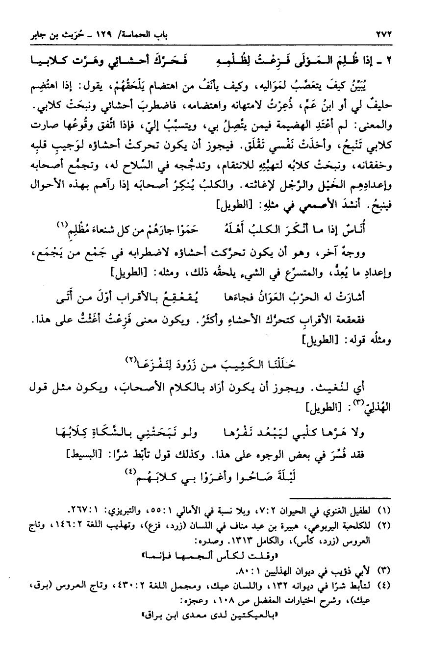 يبين كيف يتعصب لمواليه، وكيف يأنف من اهتضام يلحقهم، يقول: إذا اهتضم حليفٌ لي أو ابن عمٍ، ذعرت لامتهانه واهتضامه، فاضطرب أحشائي ونبحت كلابي. والمعنى: لم أعتد الهضيمة فيمن يتصل بي، ويتسبب إلي، فإذا اتفق وقوعها صارت كلابي تنبح، وأخذت نفسي تقلق. فيجوز أن يكون تحركت أحشاؤه لو جيب قلبه وخفقانه، ونبحت كلابه لتهيئه للانتقام، وتدججه في السلاح له، وتجمع أصحابه وإعدادهم الخيل والرجل لإغاثته. والكلب ينكر أصحابه إذا رآهم بهذه الأحوال فينبح. أنشد الأصمعي في مثله: